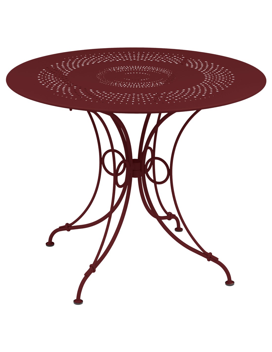 Stůl je ukázkou řemeslného know-how – jemné perforace desky i ručně kované kroužky podtrhují jeho jedinečný charakter. Je vyroben ve francouzské dílně v Thoissey a opatřen odolným polyesterovým lakem, který chrání proti UV záření i nepříznivému počasí.