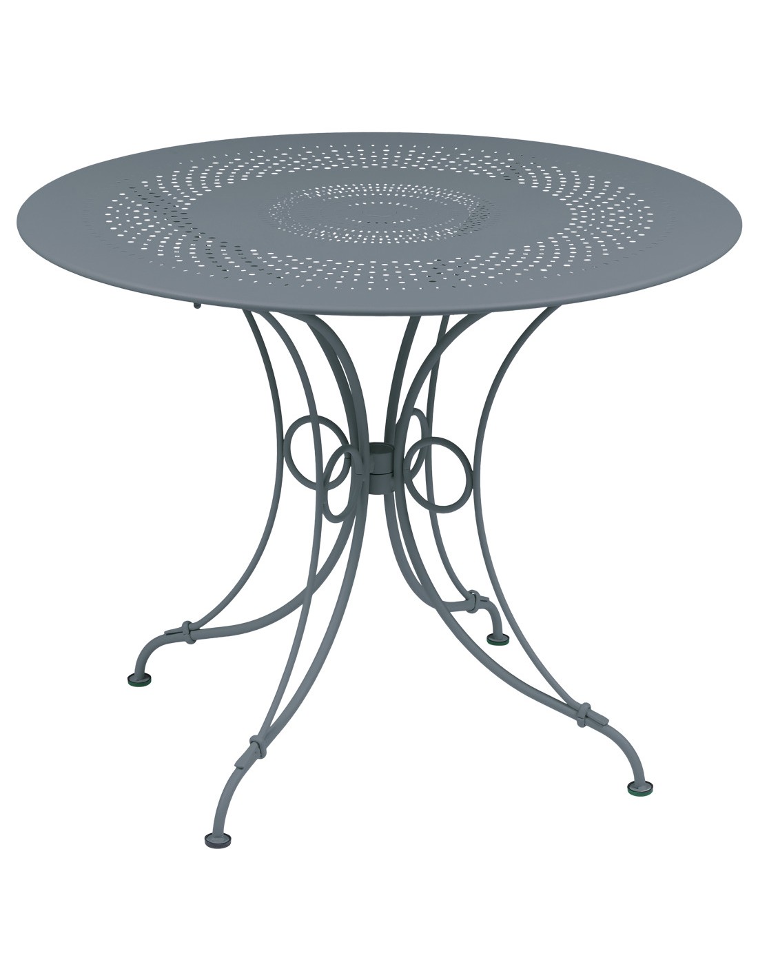 Stůl je ukázkou řemeslného know-how – jemné perforace desky i ručně kované kroužky podtrhují jeho jedinečný charakter. Je vyroben ve francouzské dílně v Thoissey a opatřen odolným polyesterovým lakem, který chrání proti UV záření i nepříznivému počasí.