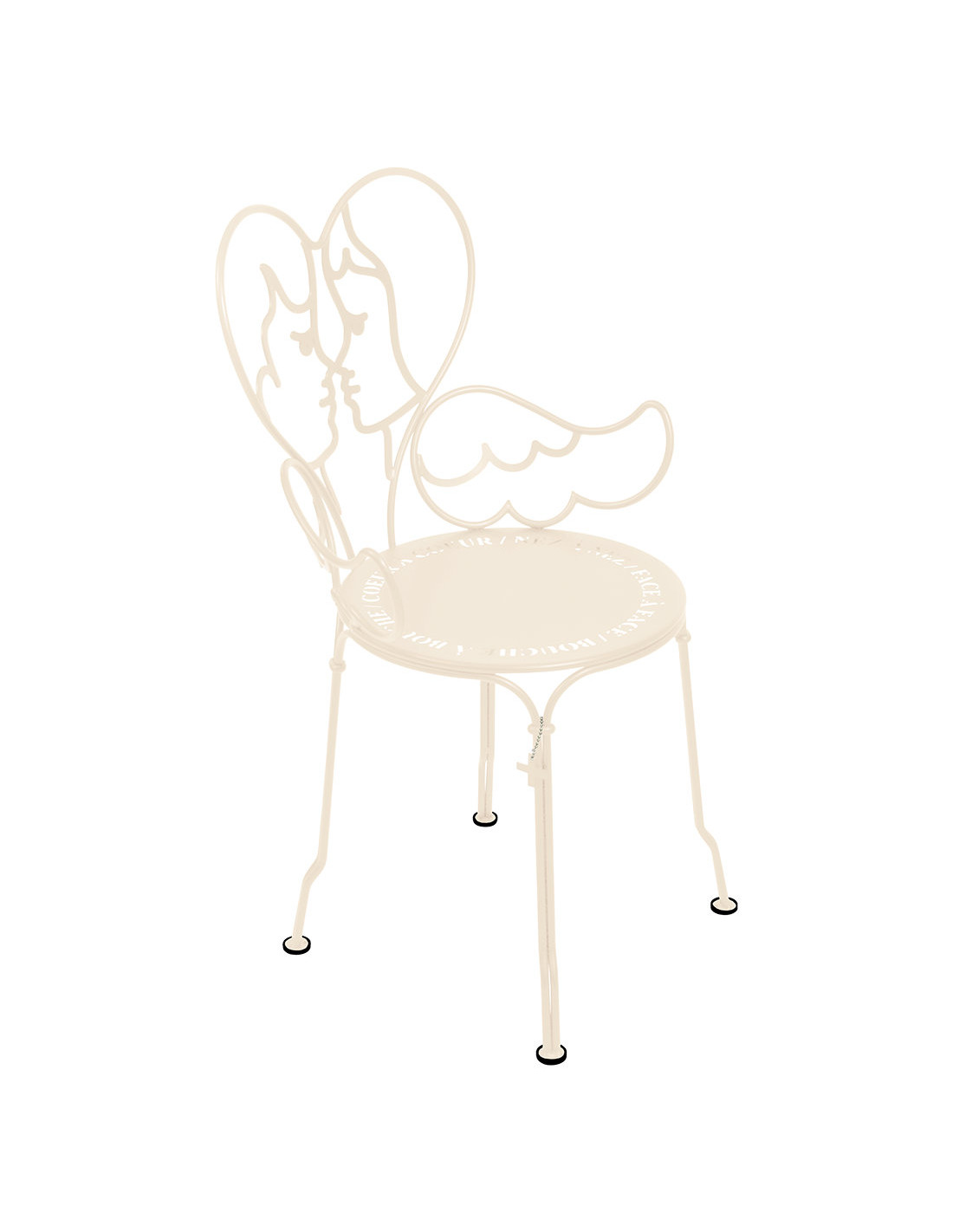 Židle Ange od značky Fermob, navržená designérem Jean-Charles de Castelbajac, je originální pojetí ikonické židle 1900, které spojuje svět módy, umění a řemeslné preciznosti. Tento výjimečný kus nábytku působí jako „poezie v pohybu“ – jeho tvar evokuje rozepjatá křídla a lehkost, která vybízí k odpočinku. Opěradlo je tvořeno dvěma andílky v jemném motivu srdce, které je nejen dekorativní, ale i pohodlné pro opření zad.
