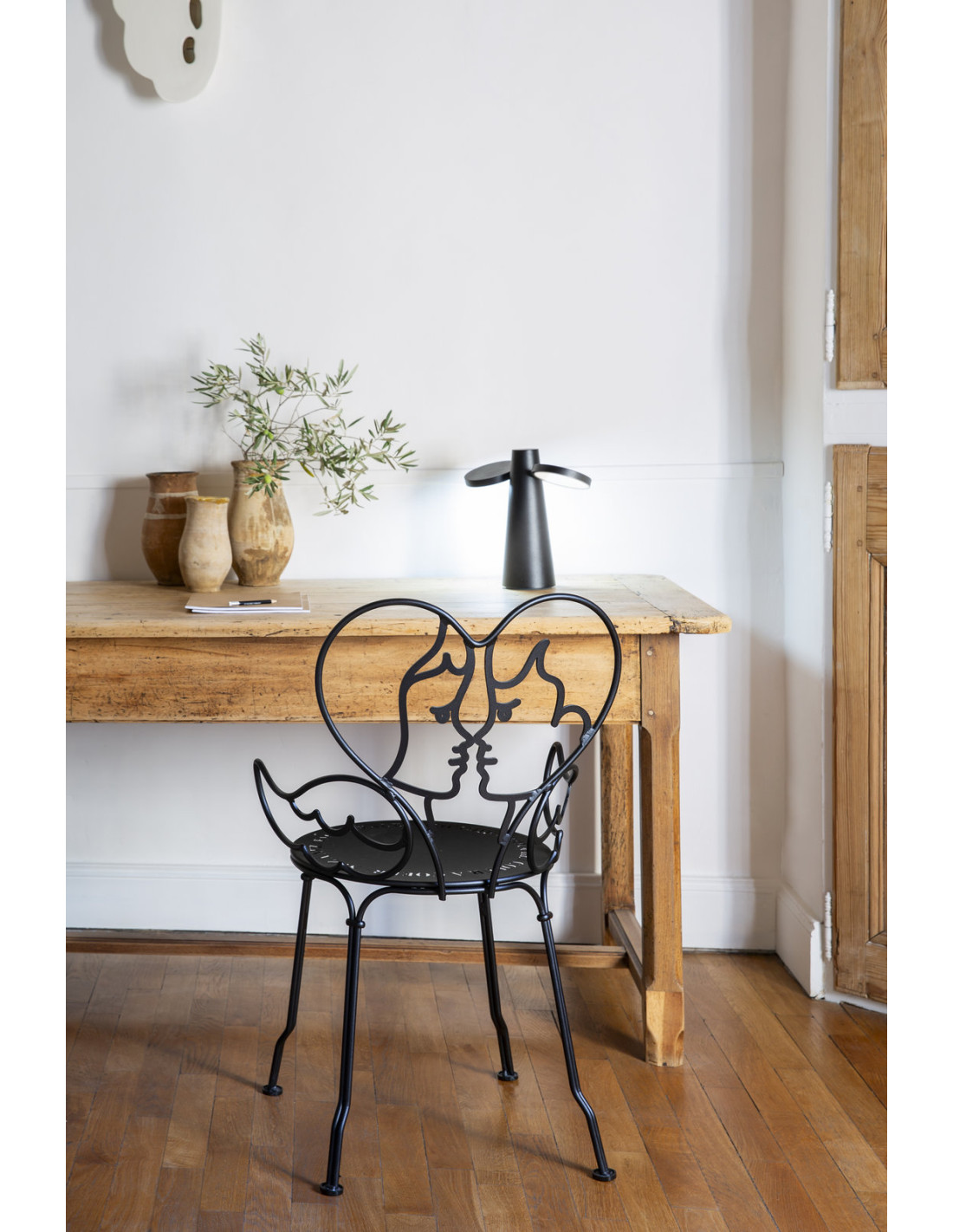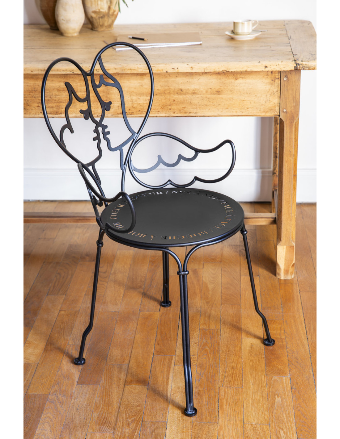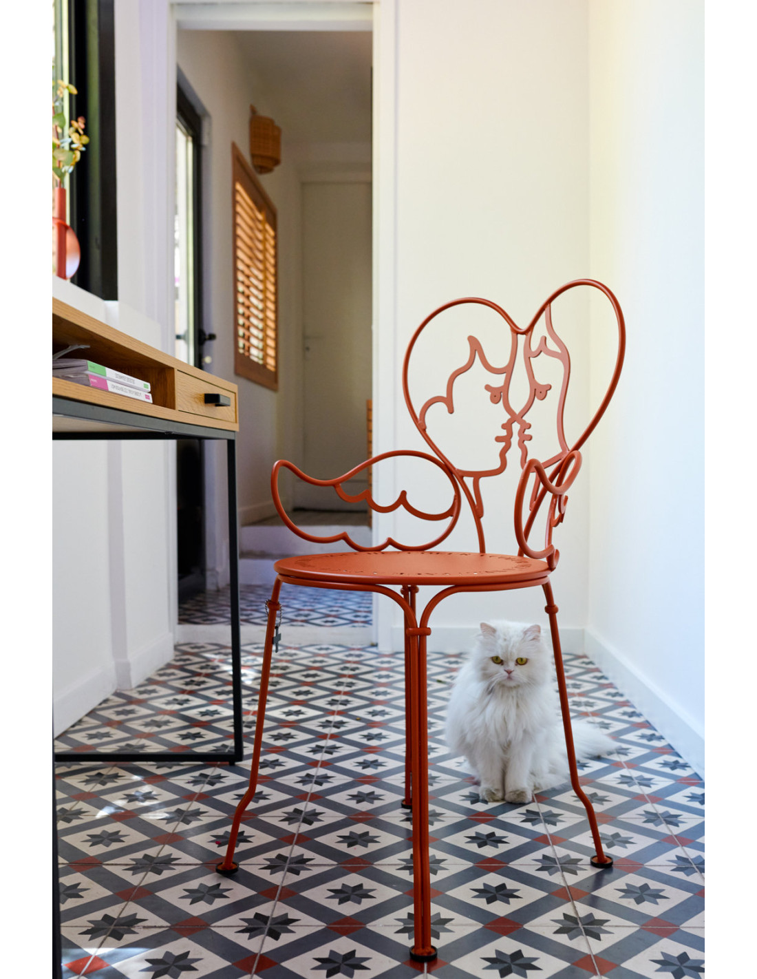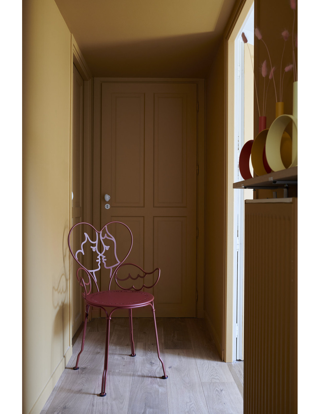 Židle Ange od značky Fermob, navržená designérem Jean-Charles de Castelbajac, je originální pojetí ikonické židle 1900, které spojuje svět módy, umění a řemeslné preciznosti. Tento výjimečný kus nábytku působí jako „poezie v pohybu“ – jeho tvar evokuje rozepjatá křídla a lehkost, která vybízí k odpočinku. Opěradlo je tvořeno dvěma andílky v jemném motivu srdce, které je nejen dekorativní, ale i pohodlné pro opření zad.