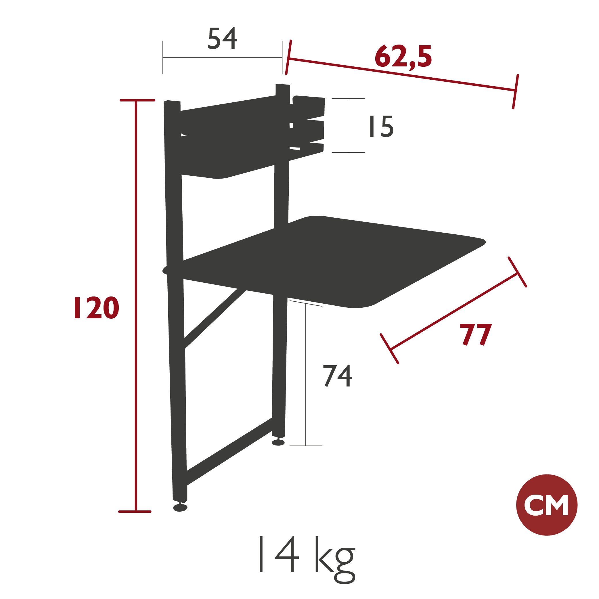 Rozměry: celková výška 120cm, šířka 77cm, hloubka 62,5cm. Výška stolu - desky 74cm.