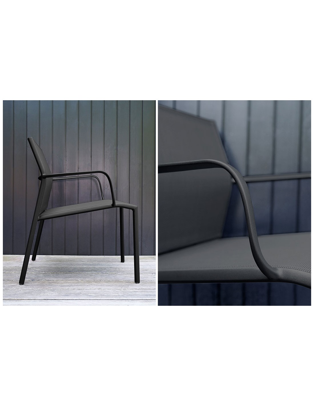 Materiál: rám židle hliník s povrchovou venkovní úpravou, sedadlo a opěradlo v Batyline® OTF: ISO s UV ochranou (výplet odolný proti plísním, roztržení, skvrnám, deformacím), tiché plastové podložky.