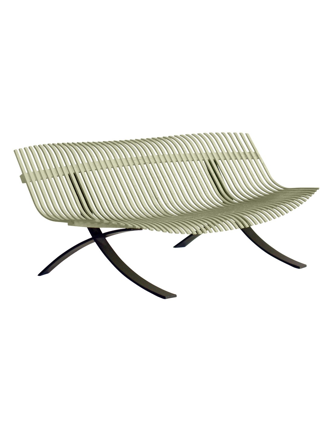 Výjimečná, elegantní lavice, která designově připomíná houpací síť, vybízí k odpočinku. Lavice je velice pohodlná, zakřivené hliníkové lamely tvoří sedák i opěrák a tvarově jsou přizpůsobeny pro příjemné sezení. Ocelové nohy ve tvaru kříže dělají lavici pevnou a schopnou unést váhu až šesti lidí. Lavice se vyrábí v mnoha barevných odstínech, jen základna nohou je vždy v barvě černé, odstín Liquorice.