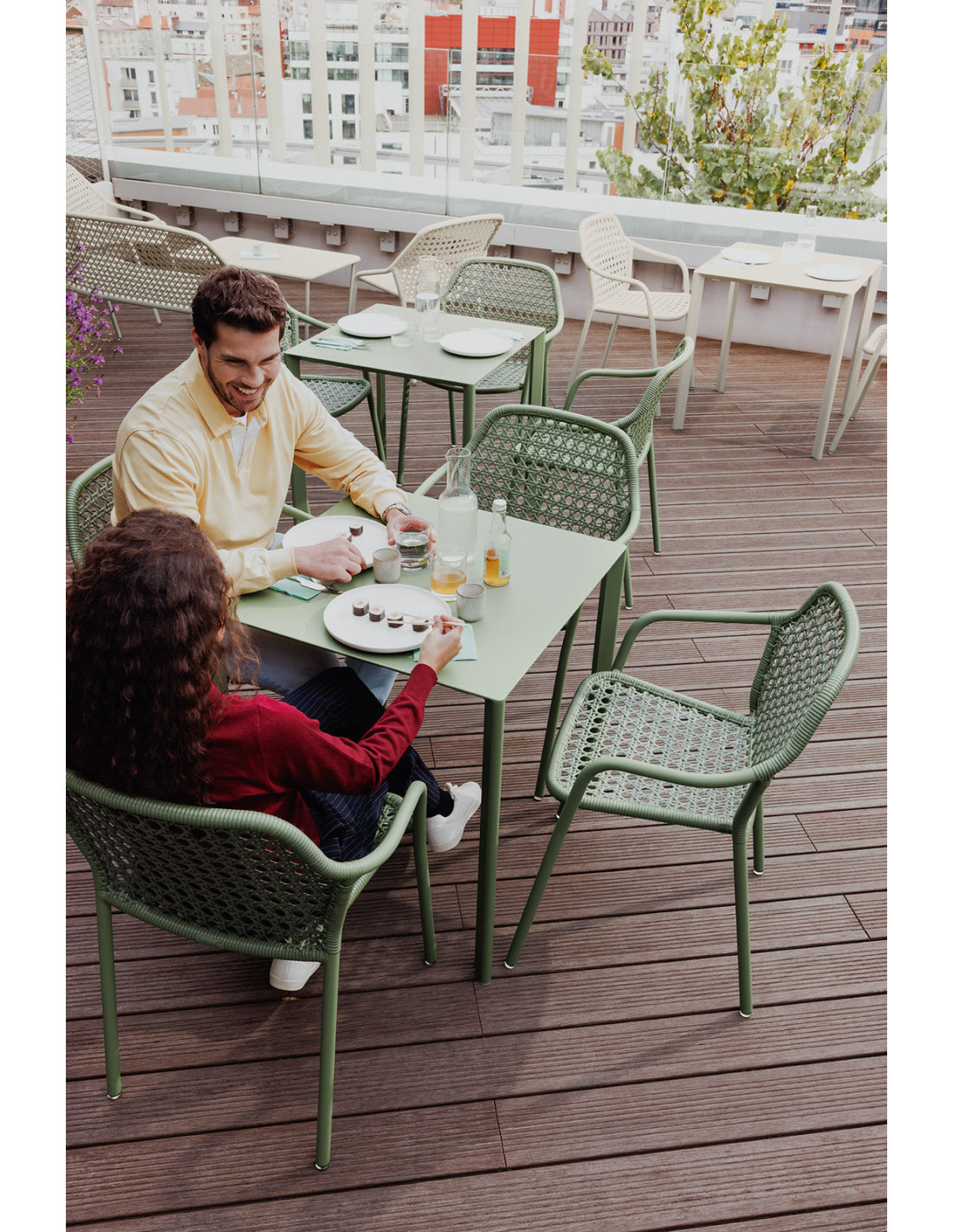 Výplet z odolného syntetického materiálu evokuje ruční tkaní cannage, dodává židli lehkost a vzdušnost typickou pro francouzské kavárenské židle, přitom je odolný vůči povětrnostním vlivům a snadno se udržuje. Lehká a pevná hliníková konstrukce zajišťuje stabilitu a dlouhou životnost.