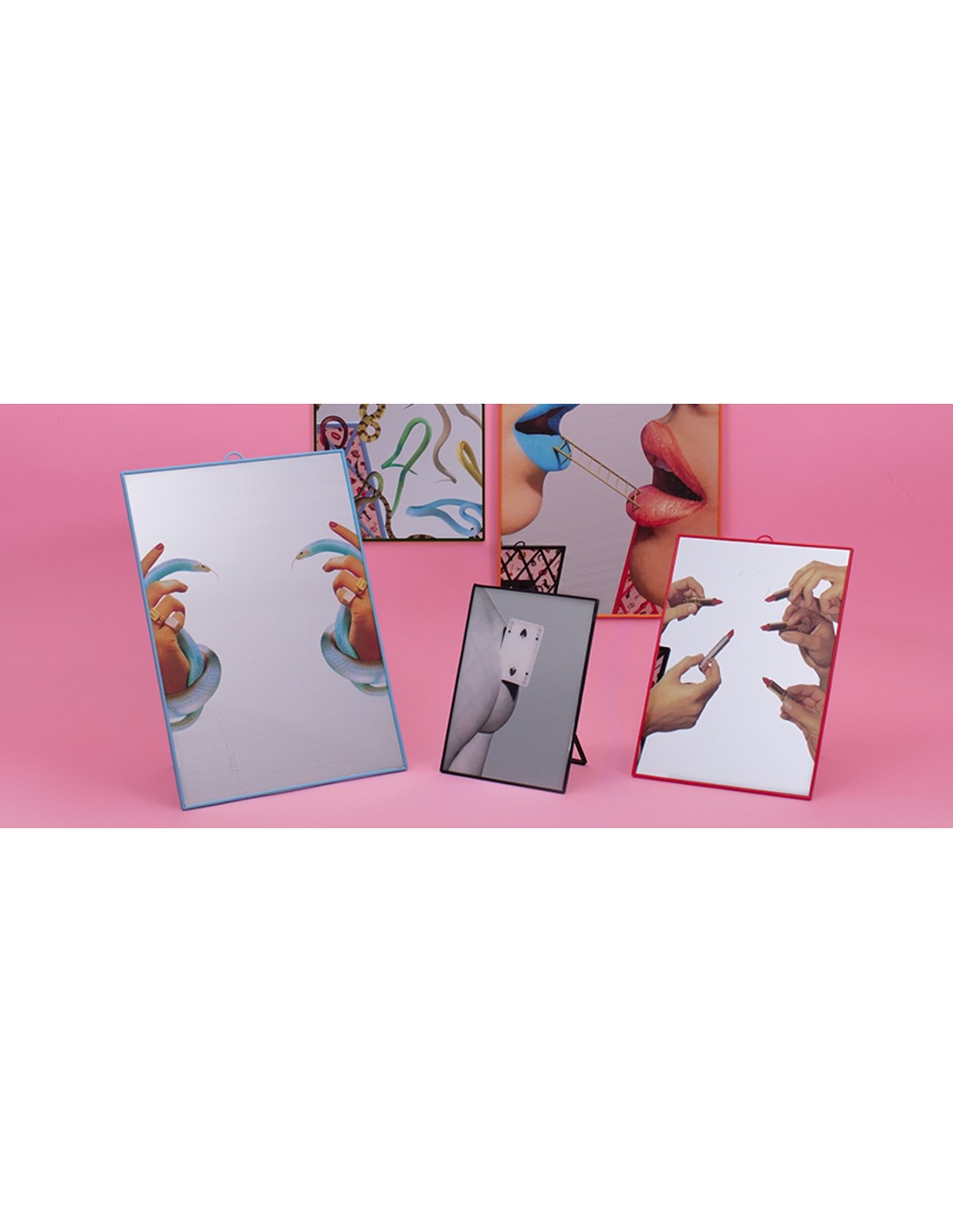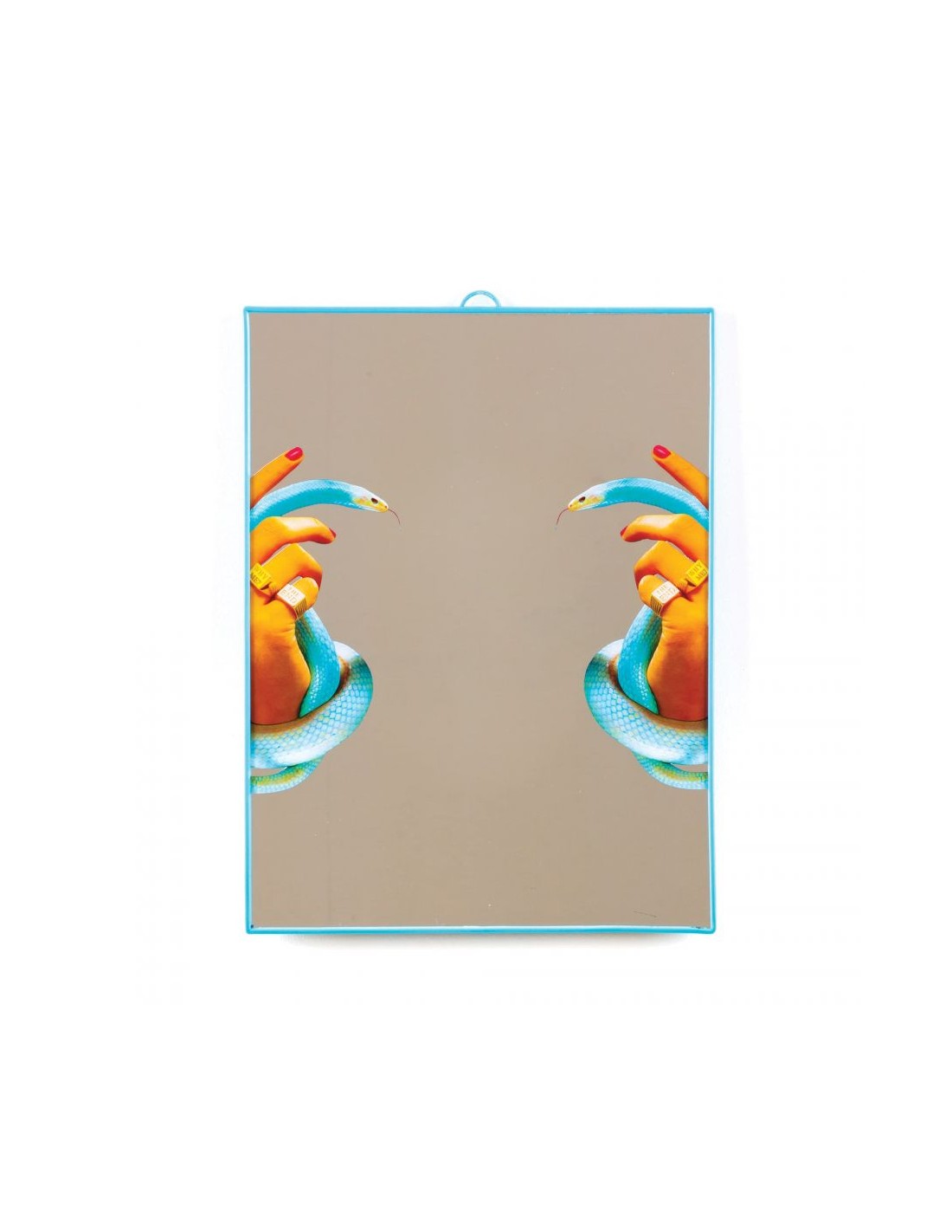 Stolní zrcadlo z kolekce Toiletpaper s bláznivým potiskem rukou držících hady na zrcadlové části. Zrcadlo má subtilní plastový  rámeček ve světle modré barvě, můžete ho zavěsit, nebo rovnou postavit na stůl.