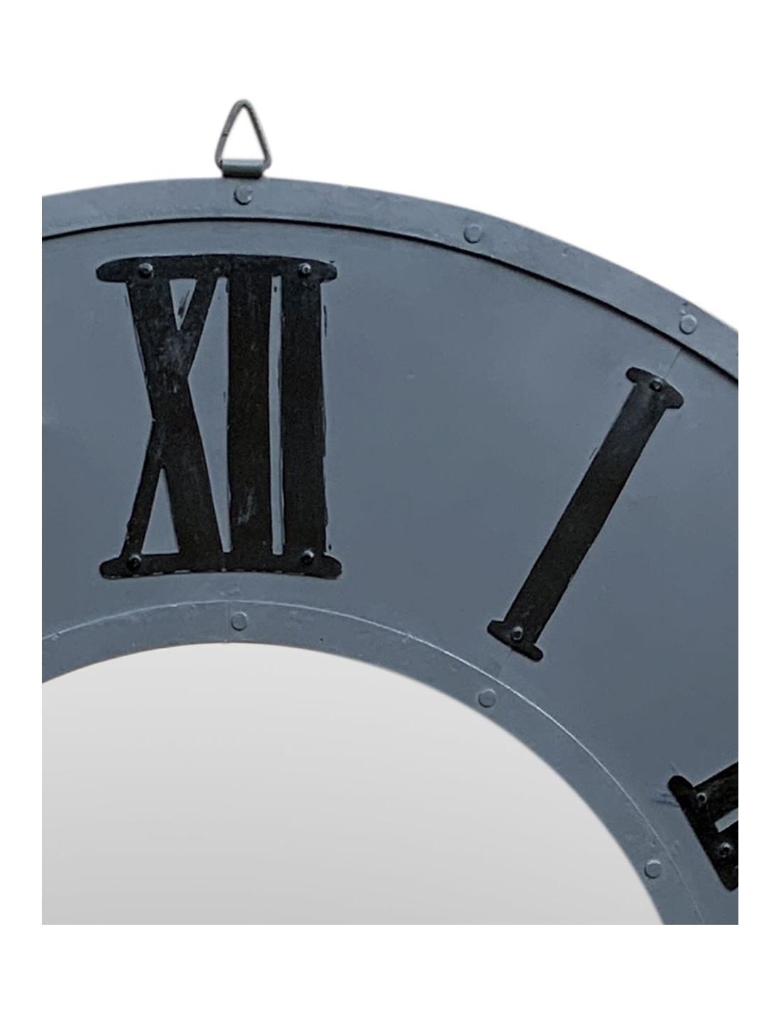 Zrcadlo s výrazným kovovým rámem, rám je v šedé barvě a jsou na něm namalovány římské číslice ve stylu ciferníku. Velké zrcadlo bude výraznou dekorací vašeho interiéru. Zadní strana je zakryta deskou.