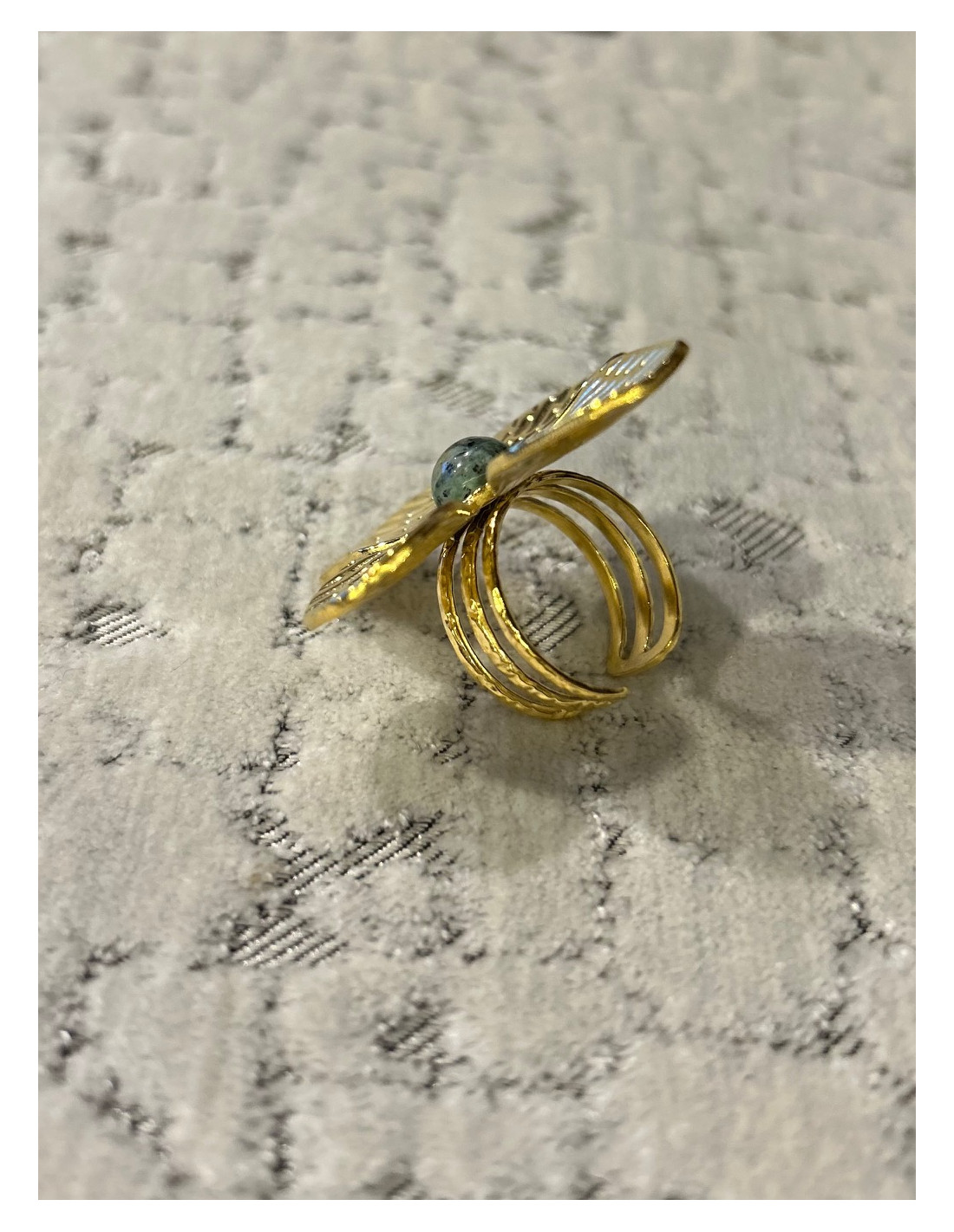 Ozdobný prsten ve tvaru květu, ve středu zdobený kamenem Zoisitem z limitovaných kolekcí značky Piou Piou. Tvarovaný prsten ve zlaté barvě má nastavitelnou velikost.