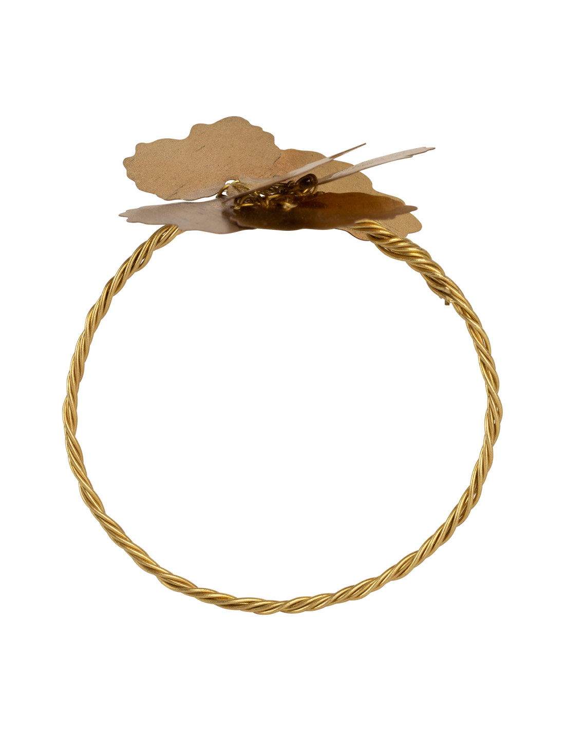 Krásný kroužek na látkový ubrousek ze zlaté mosazy stylově doplní vaše stolování. Kroužek tvoří několik obtočených drátků, které jsou ozdobeny několika vykrajovanými lístky z tenkého mosazného plechu.