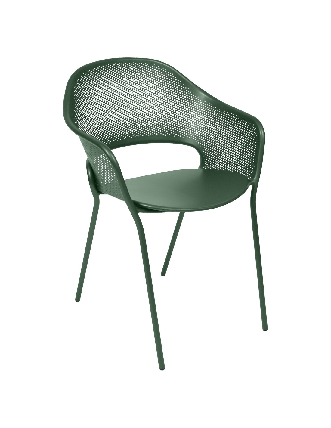 Materiál: lakovaná ocel s venkovní povrchovou úpravou a UV ochranou, plastové podložky. K židli výrobce nabízí kulatý sedák z řady Basic, průměr 43x42 cm.Vyrobeno ve Francii.