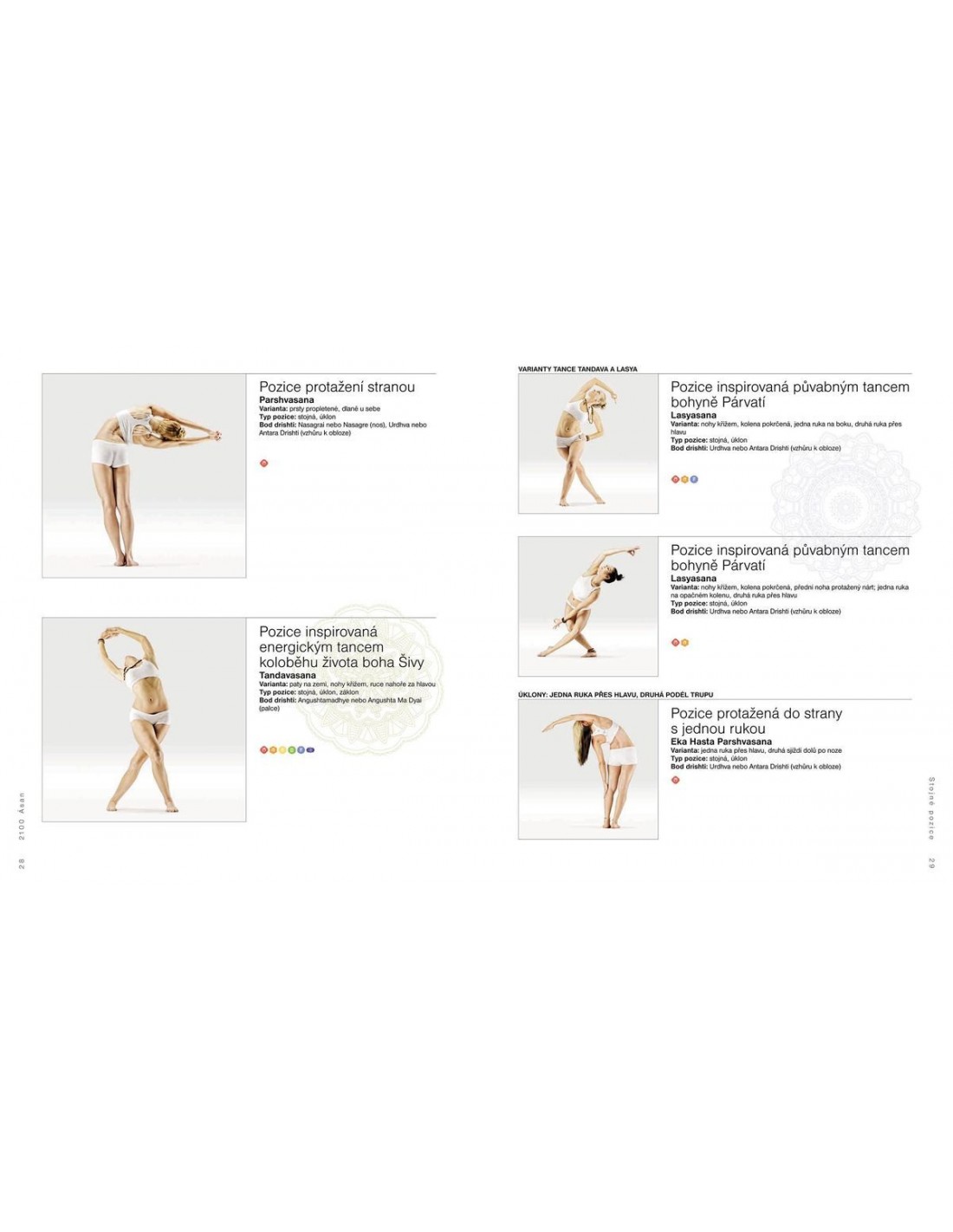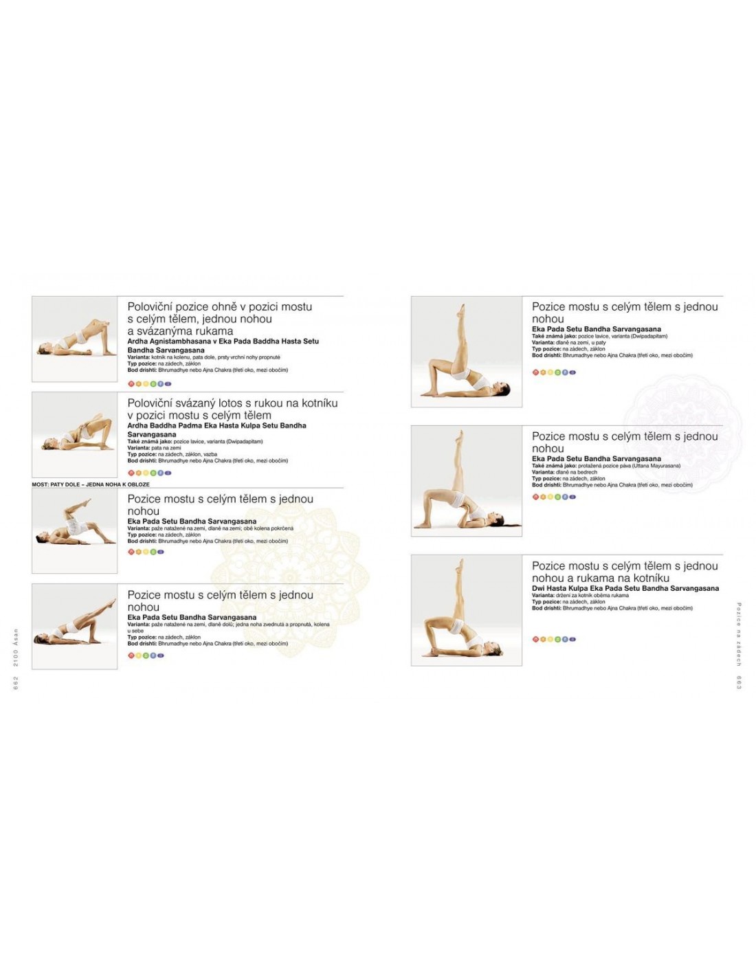 Pozice jsou rozděleny do devíti hlavních kategorií - stojné pozice, pozice v sedě, pozice zaměřené na střed těla, pozice na čtyřech, záklony, balance na pažích, obrácené pozice, pozice na břiše, pozice na zádech - a dále seřazeny do skupin ásan, které obvykle postupují od nejsnažšího provedení k náročnějším variantám. Každá z fotografií je opatřena názvem pozice v češtině a v sanskrtu, alternativními názvy pozice, pokud existují, a popisem různých variant každé pozice, bodu drišti (místo, kam by měla směřovat pozornost) a čakrami, které pozice ovlivňuje.