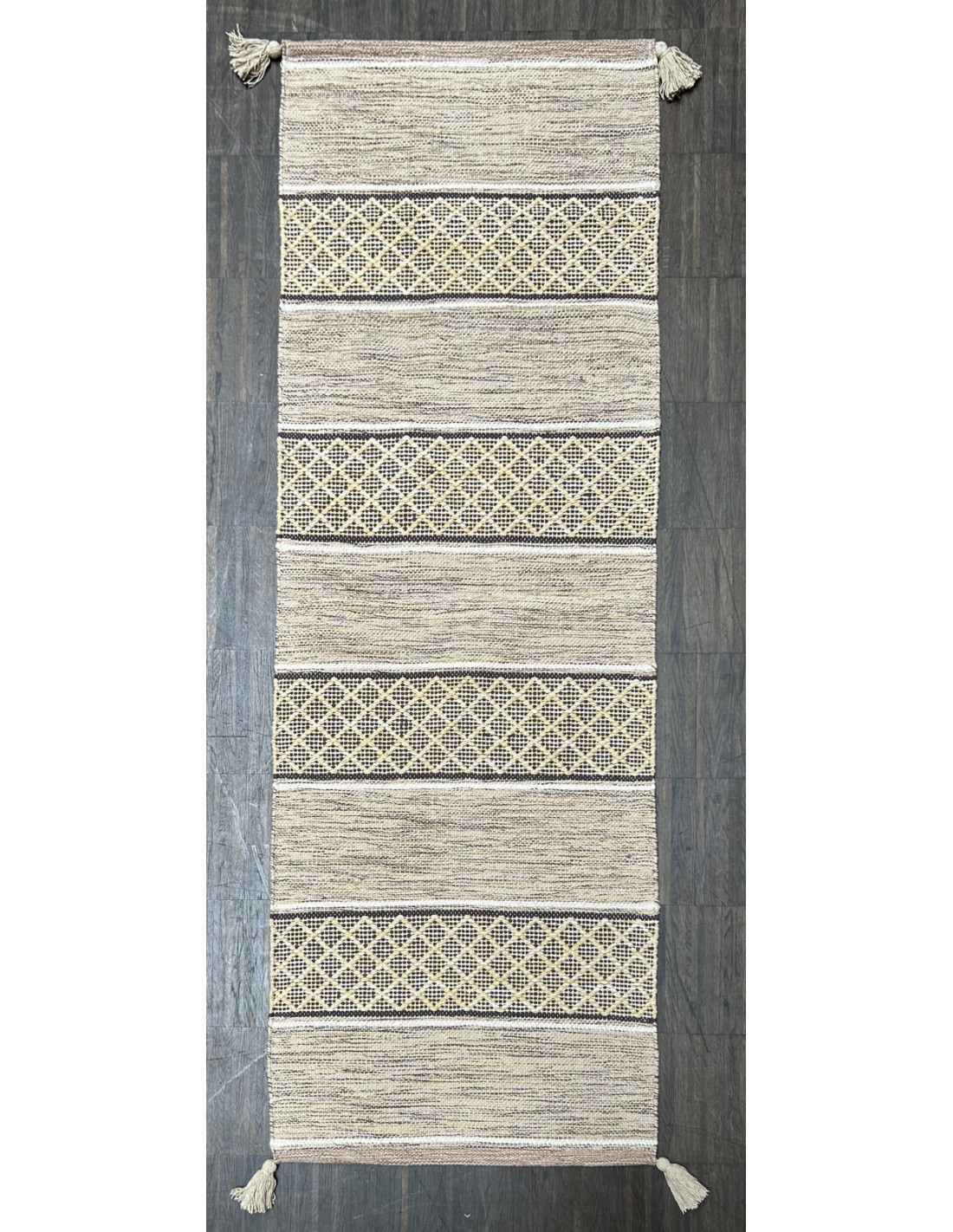 Ručně tkaný bavlněný kobereček - běhoun s geometrickým vzorem vnese do interiéru přirozený styl a osobitý charakter. Díky kvalitnímu zpracování je příjemný na dotek, lehký a zároveň dostatečně odolný pro každodenní použití. Geometrický motiv dodává koberci moderní vzhled a snadno jej sladíte s různými styly interiéru – od skandinávského po boho. Ideální jako dekorativní prvek do obývacího pokoje, ložnice nebo předsíně. Koberec v béžové barvě s tmavě hnědým vzorem má v rozích ozdobné střapce.