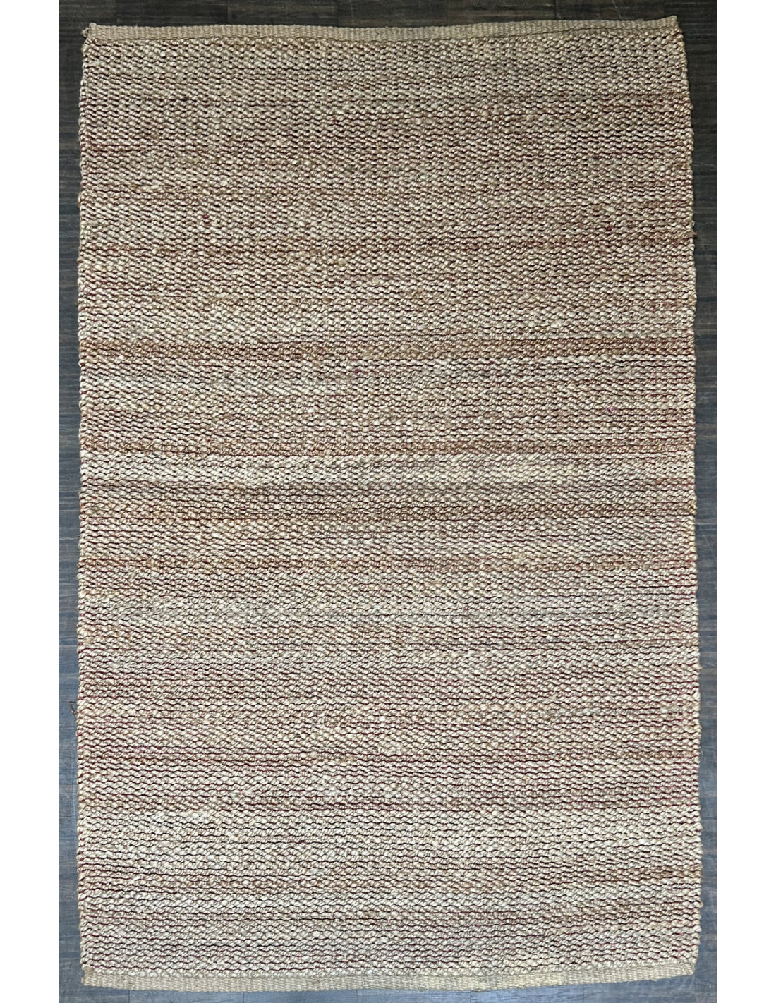 Barevný koberec v přírodní béžové barvě s červenou vetkávanou linkou je vyroben ze 100% přírodního materiálu - z konopných vláken. Ručně tkaný koberec je hladký, s výraznější strukturu tkaní. Kratší strany koberce jsou hladké. Pod koberec doporučujeme použít protiskluzovou podložku.
