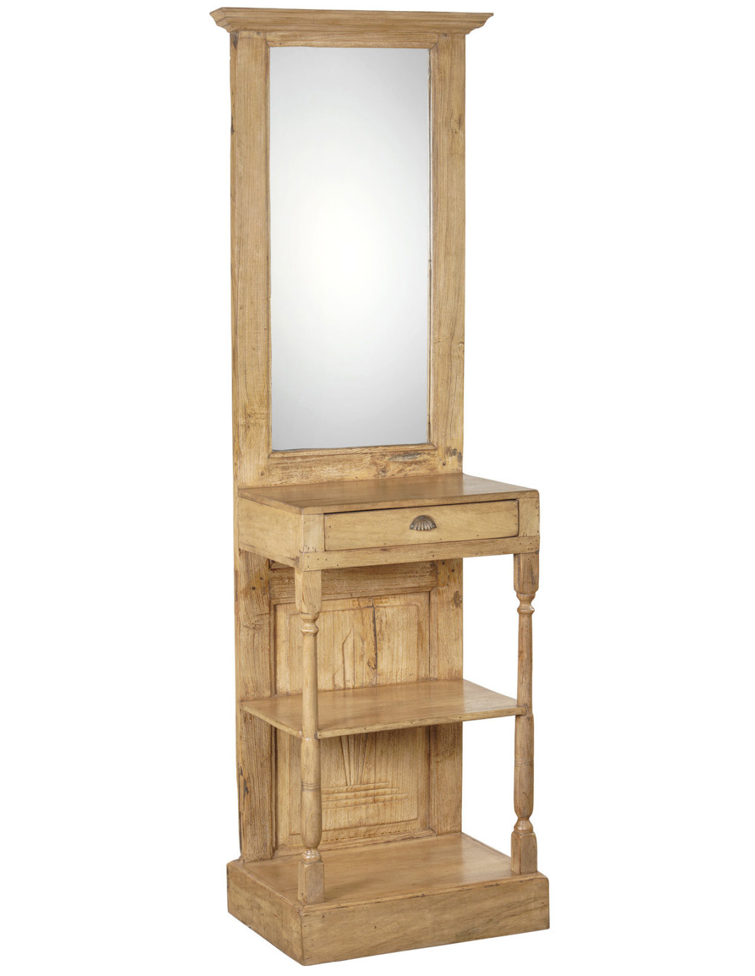 Jedinečný kousek, který kombinuje krásu přírodního materiálu a funkčnost. Tento stojan je vyroben z masivního teakového dřeva, známého svou odolností a nádhernou kresbou. Horní část tvoří zrcadlo, které opticky zvětší prostor a dodá interiéru světlo. Spodní odkládací police nabízí praktické místo pro uložení drobných dekorací, košů či každodenních nezbytností. Díky svému nadčasovému designu a přírodnímu vzhledu se hodí jak do předsíně, tak i do ložnice nebo šatny.