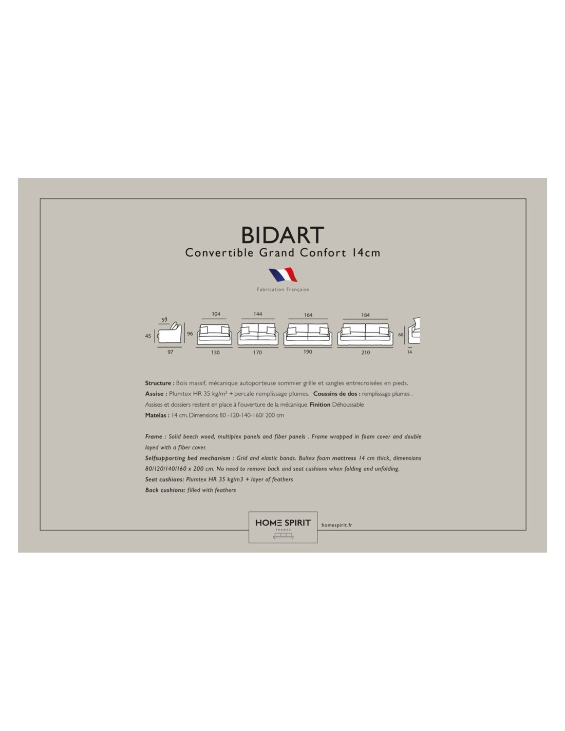 Nabízíme vám pohodlnou malou pohovku Bidart s potahem ze silného lnu. Opírání zajišťuje velký polštář vyplněny peřím a 2 menší polštáře v rozměru 40x40cm. Pohodlné sezení vám dopřeje kvalitní PUR pěna s vrstvou peří. S rozkládacím mechanismem Grand Confort jednoduše sedačku rozložíte na pohodlné lůžko s matrací vysokou 14 cm.