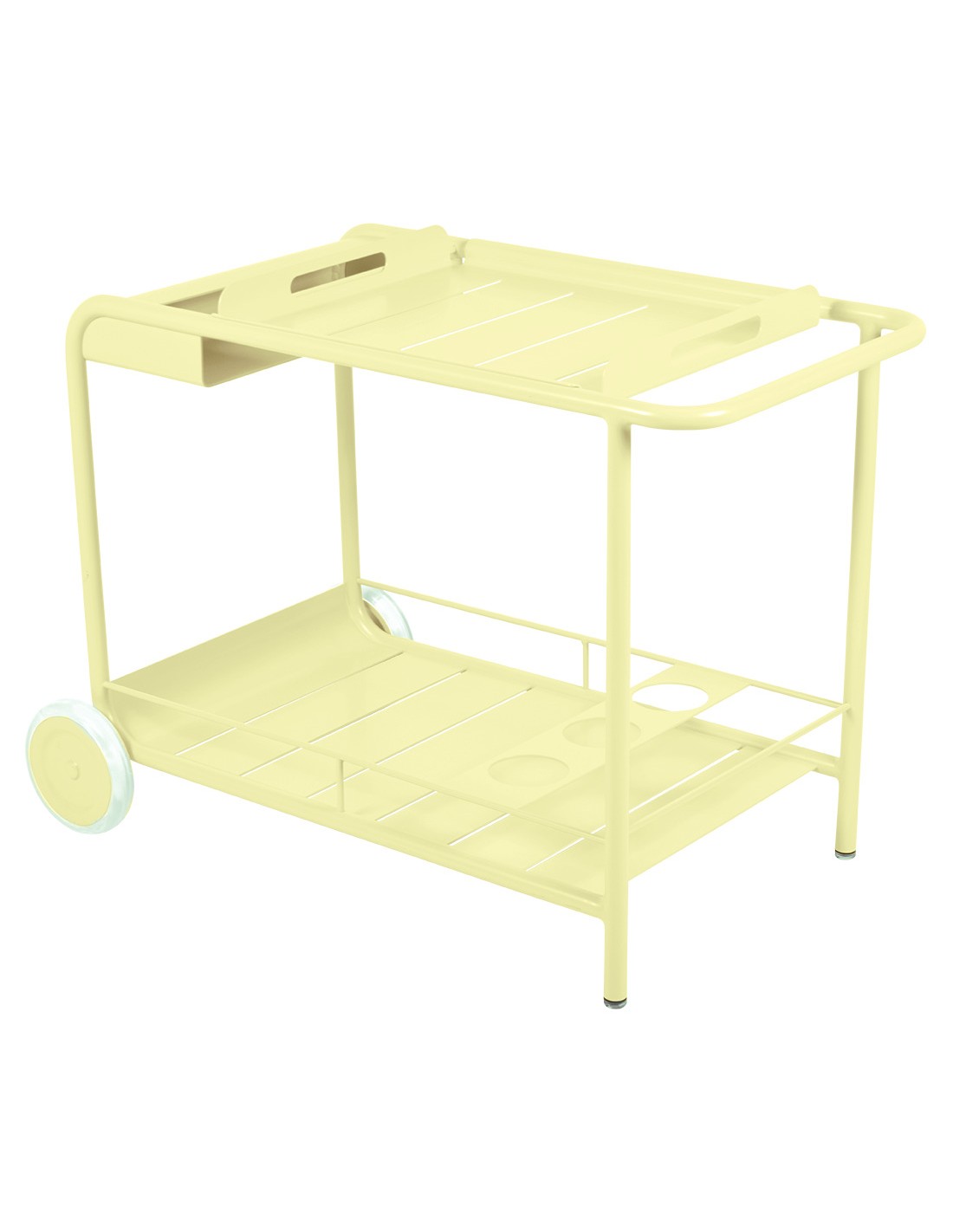 Pojízdný bar - servírovací stolek z kolekce Luxembourg je nejen hezký na pohled, ale i velmi praktický. Můžete jím doplnit venkovní kuchyni, nebo jídelní prostor venku i vevnitř. Stolek má odnímatelný tác ( 53 x 46,5 x 5,5 cm), který je ideální pro obsluhu hostů, příhrádku na láhve a díky kolečkům a hliníkovému materiálu, ze kterého je vyroben, ho můžete lehce přemístit všude tam, kam potřebujete. Tak jako všechny výrobky značky Fermob, i tento stolek odolá i těm nejnáročnějším venkovním podmínkám.