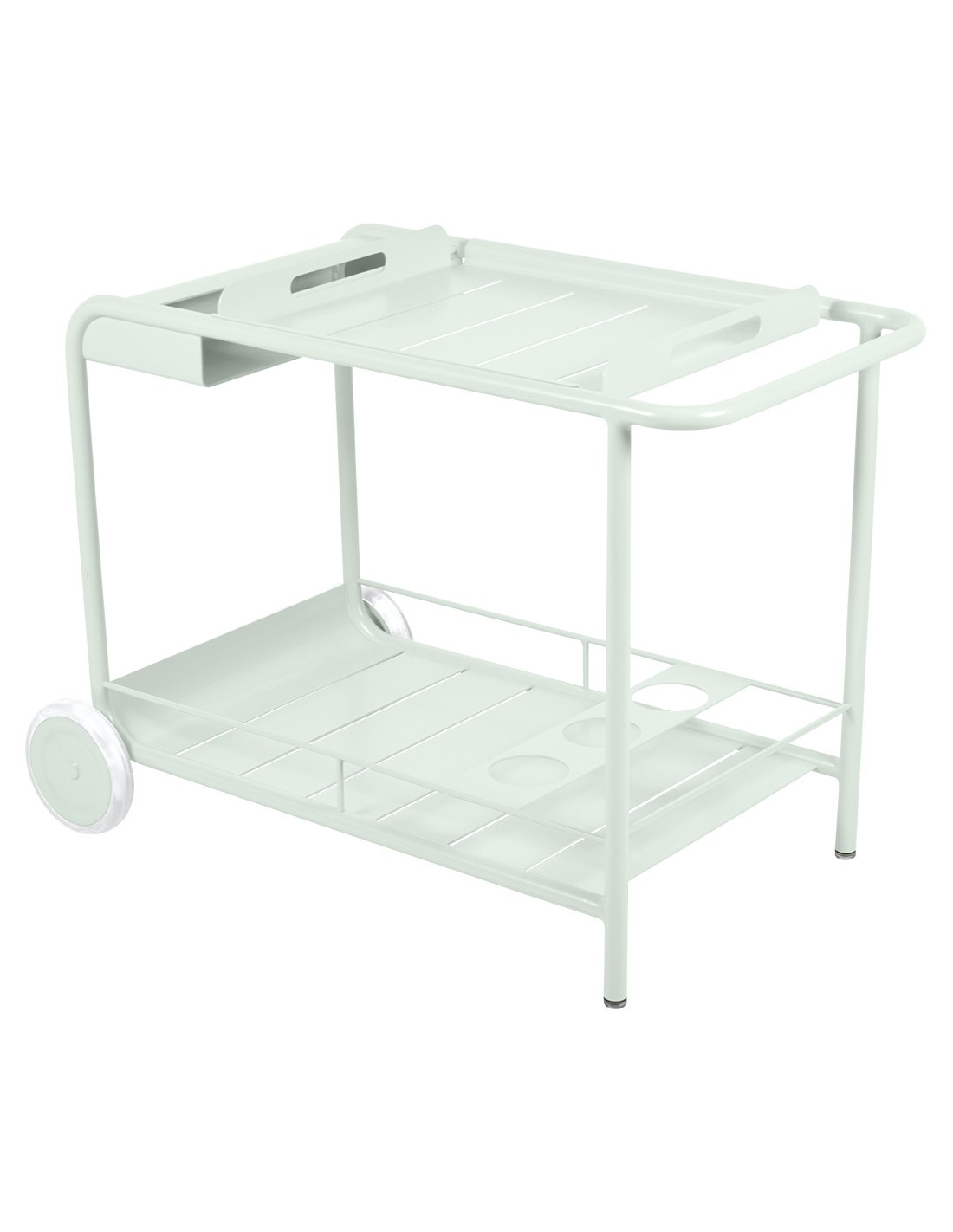 Pojízdný bar - servírovací stolek z kolekce Luxembourg je nejen hezký na pohled, ale i velmi praktický. Můžete jím doplnit venkovní kuchyni, nebo jídelní prostor venku i vevnitř. Stolek má odnímatelný tác ( 53 x 46,5 x 5,5 cm), který je ideální pro obsluhu hostů, příhrádku na láhve a díky kolečkům a hliníkovému materiálu, ze kterého je vyroben, ho můžete lehce přemístit všude tam, kam potřebujete. Tak jako všechny výrobky značky Fermob, i tento stolek odolá i těm nejnáročnějším venkovním podmínkám.