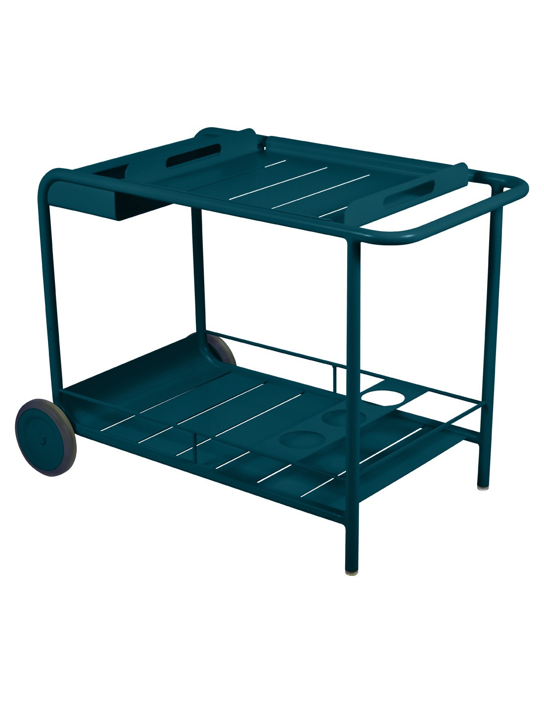 Pojízdný bar - servírovací stolek z kolekce Luxembourg je nejen hezký na pohled, ale i velmi praktický. Můžete jím doplnit venkovní kuchyni, nebo jídelní prostor venku i vevnitř. Stolek má odnímatelný tác ( 53 x 46,5 x 5,5 cm), který je ideální pro obsluhu hostů, příhrádku na láhve a díky kolečkům a hliníkovému materiálu, ze kterého je vyroben, ho můžete lehce přemístit všude tam, kam potřebujete. Tak jako všechny výrobky značky Fermob, i tento stolek odolá i těm nejnáročnějším venkovním podmínkám.