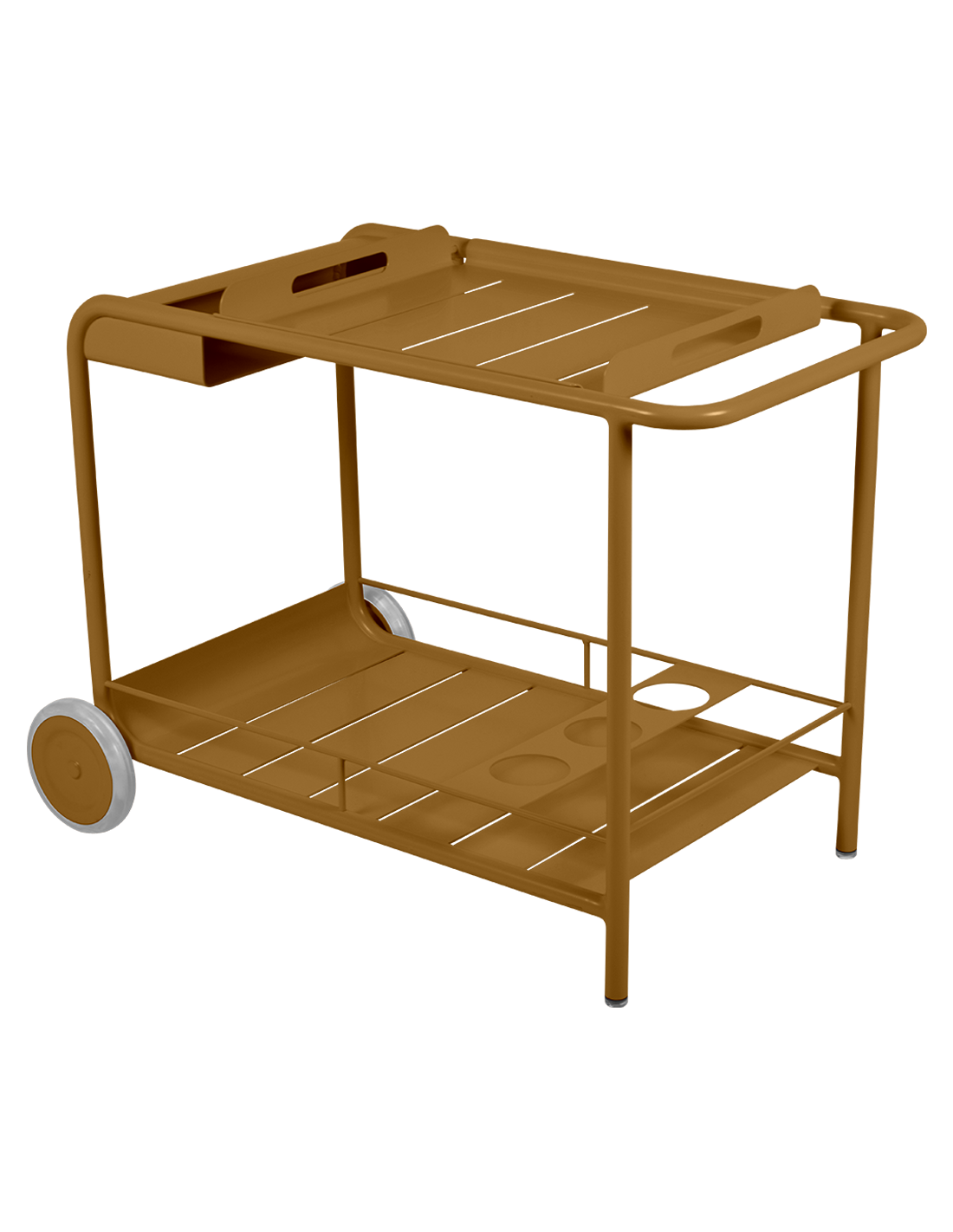Pojízdný bar - servírovací stolek z kolekce Luxembourg je nejen hezký na pohled, ale i velmi praktický. Můžete jím doplnit venkovní kuchyni, nebo jídelní prostor venku i vevnitř. Stolek má odnímatelný tác ( 53 x 46,5 x 5,5 cm), který je ideální pro obsluhu hostů, příhrádku na láhve a díky kolečkům a hliníkovému materiálu, ze kterého je vyroben, ho můžete lehce přemístit všude tam, kam potřebujete. Tak jako všechny výrobky značky Fermob, i tento stolek odolá i těm nejnáročnějším venkovním podmínkám.