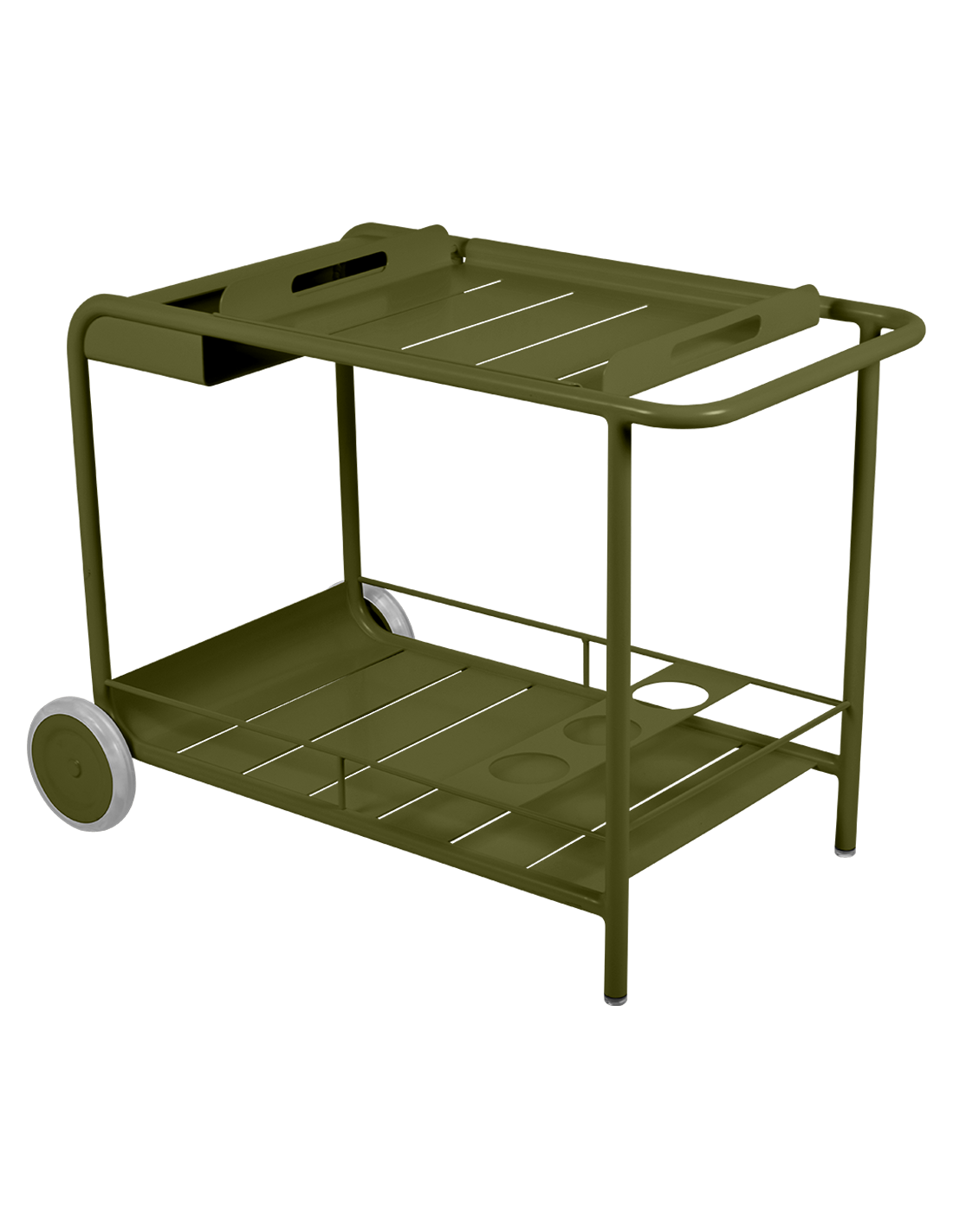 Pojízdný bar - servírovací stolek z kolekce Luxembourg je nejen hezký na pohled, ale i velmi praktický. Můžete jím doplnit venkovní kuchyni, nebo jídelní prostor venku i vevnitř. Stolek má odnímatelný tác ( 53 x 46,5 x 5,5 cm), který je ideální pro obsluhu hostů, příhrádku na láhve a díky kolečkům a hliníkovému materiálu, ze kterého je vyroben, ho můžete lehce přemístit všude tam, kam potřebujete. Tak jako všechny výrobky značky Fermob, i tento stolek odolá i těm nejnáročnějším venkovním podmínkám.