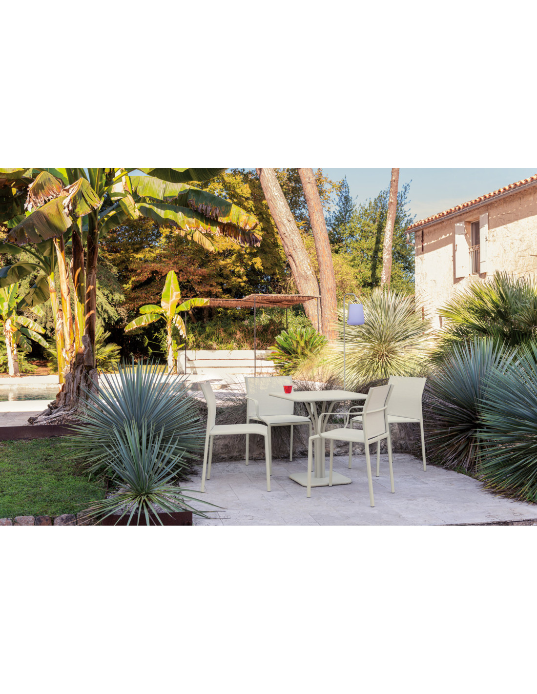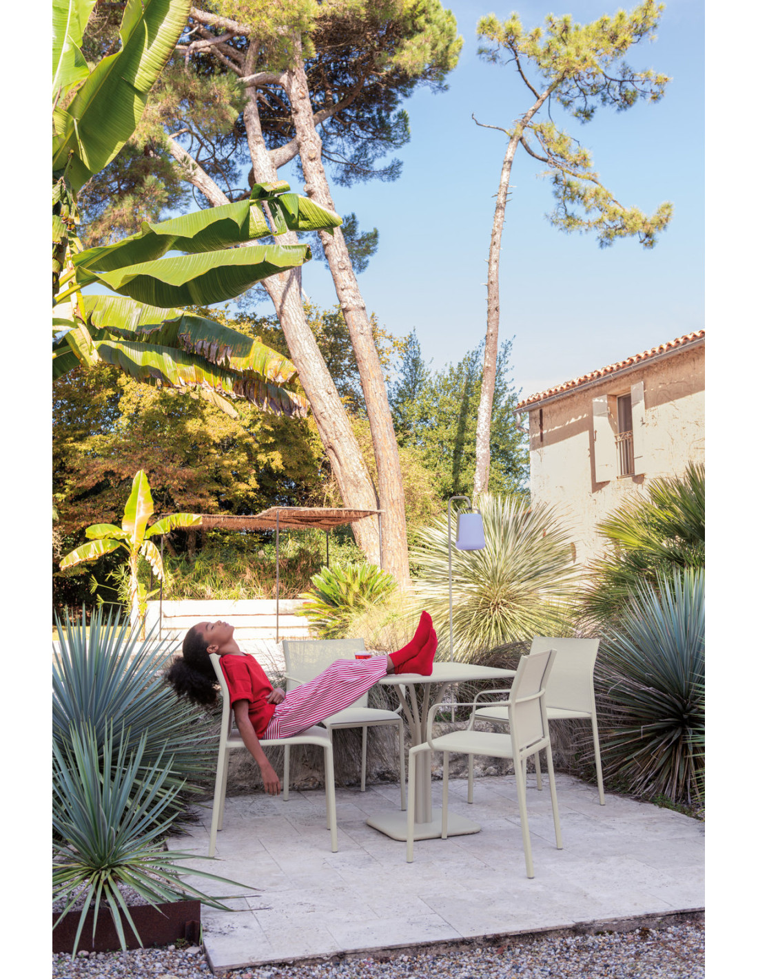 Tento zahradní jídelní stolek pro čtyři osoby se může pochlubit elegantním a kompaktním designem, díky kterému se velmi snadno přemisťuje a vejde se i do těch nejtěsnějších prostor. Pokud tedy hledáte způsob, jaký kus nábytku zvolit pro svůj balkon nebo terasu, toto je jasná volba. Stůl má plnou ocelovou desku a stabilní, centrální nohu, je navržen tak, aby vydržel dlouhá léta. Stůl můžete doplnit židlemi a stoličkami ze stejné řady.