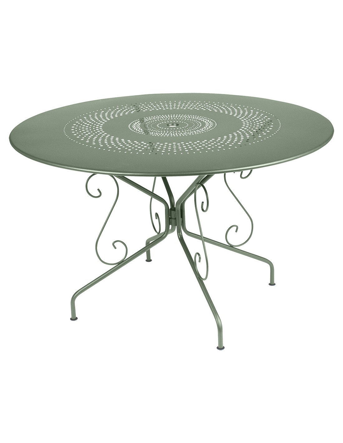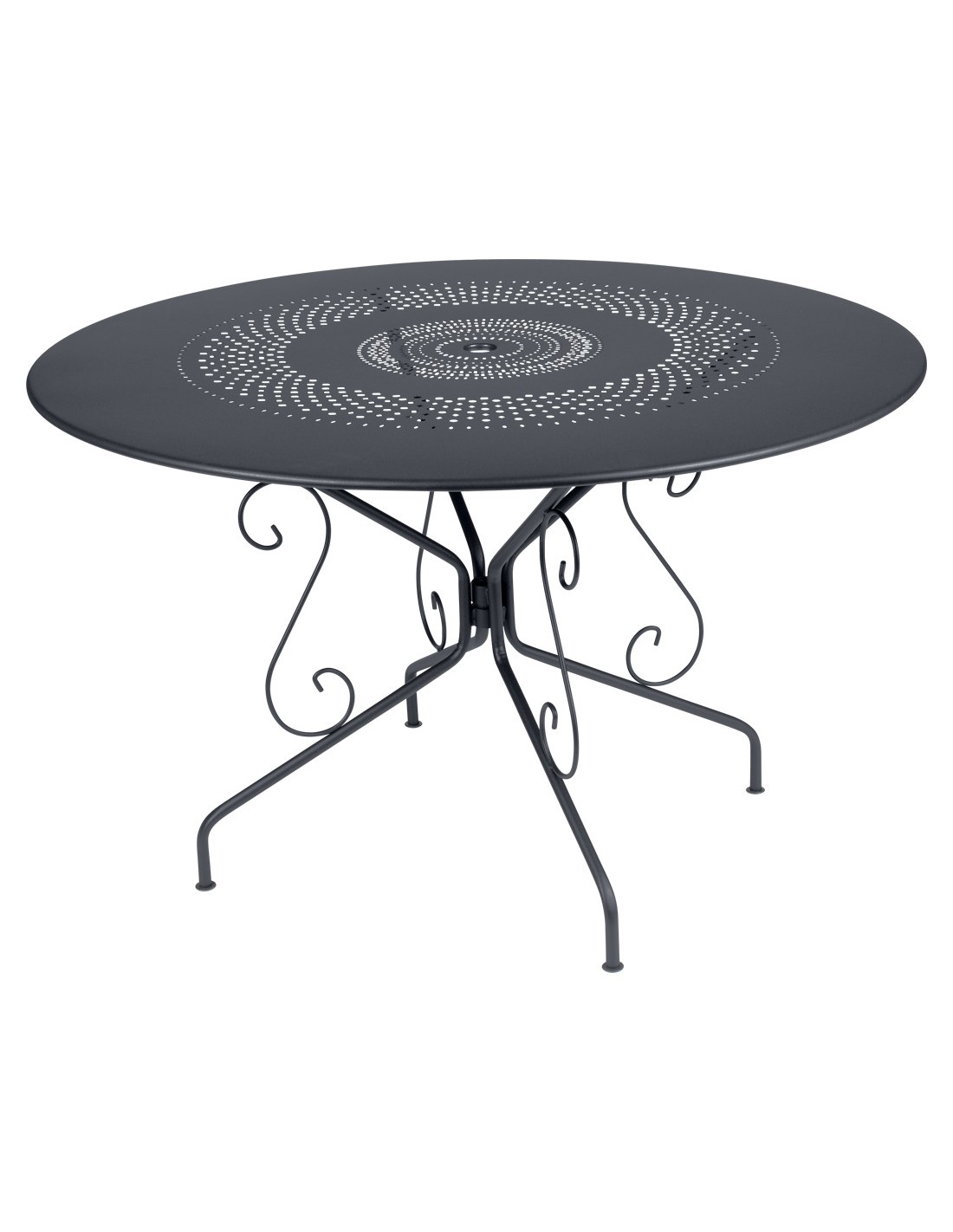 Rozměry: průměr 117cm, výška 74cm. Váha 14,2 kg.Materiál: ocelová trubková základna a perforovaná deska, vše s venkovní povrchovou úpravou a UV ochranou, plastové podložky.Vyrobeno ve Francii.