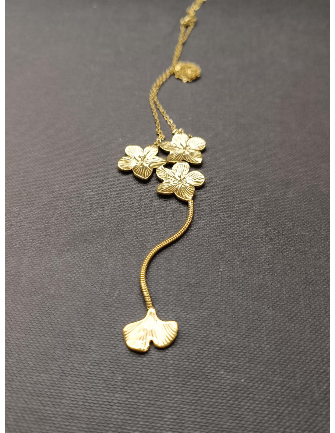 Řetízkový náhrdelník kombinuje jemnost květinového motivu s elegantním designem ginkgo listu. Překrásný šperk zdobí tři květy doplněné lístkem ginkgo, který dodává šperku jemný a sofistikovaný charakter. Tento stylový a jemný šperk podtrhne ženskost, rozzáří jednoduchý outfit a dodá elegantní akcent každému looku.