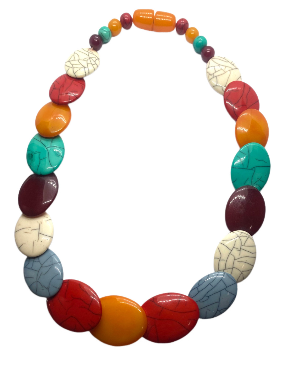 Efektní náhrdelník tvoří za sebou poskládané ploché oválky. Zapínání náhrdelníku je na závit a je schované v jednom z korálků za krkem. Tibetská bižuterie se vyznačuje umělými kameny či korálky, které věrně připomínají pravé kameny.