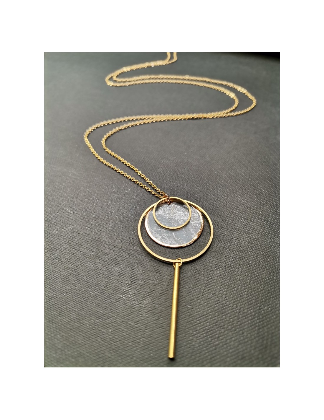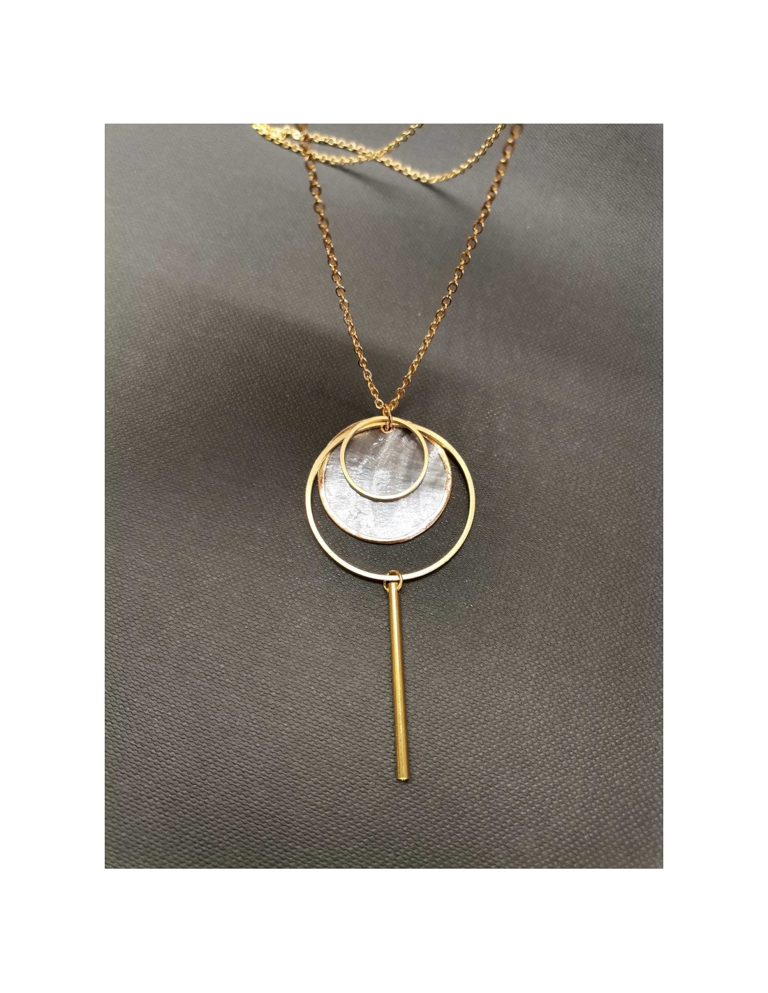 Zlatý, řetízkový náhrdelník s kulatým ověsem vyplněným perletí, se zapínáním na karabinku. Celková délka řetízku je 80cm, délka celého ověsu 6cm.