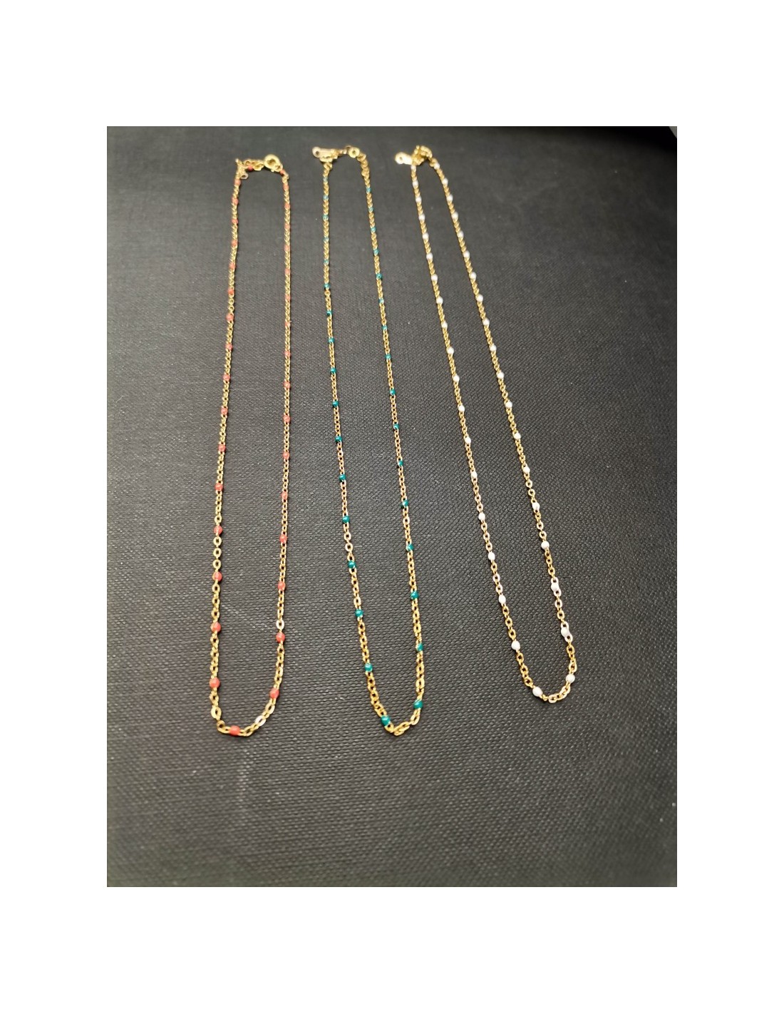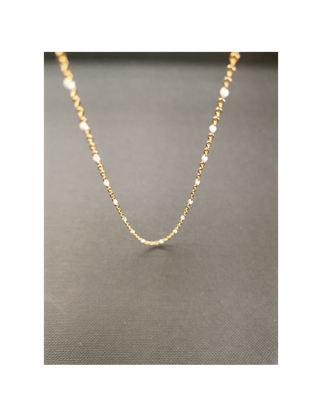 Jemný řetízek ve zlaté barvě s barevnými detaily v podobě bílých "korálků". Řetízek má zapínáním na karabinku. Celková délka řetízku je 41,5cm s možností prodloužení o 2,5cm.