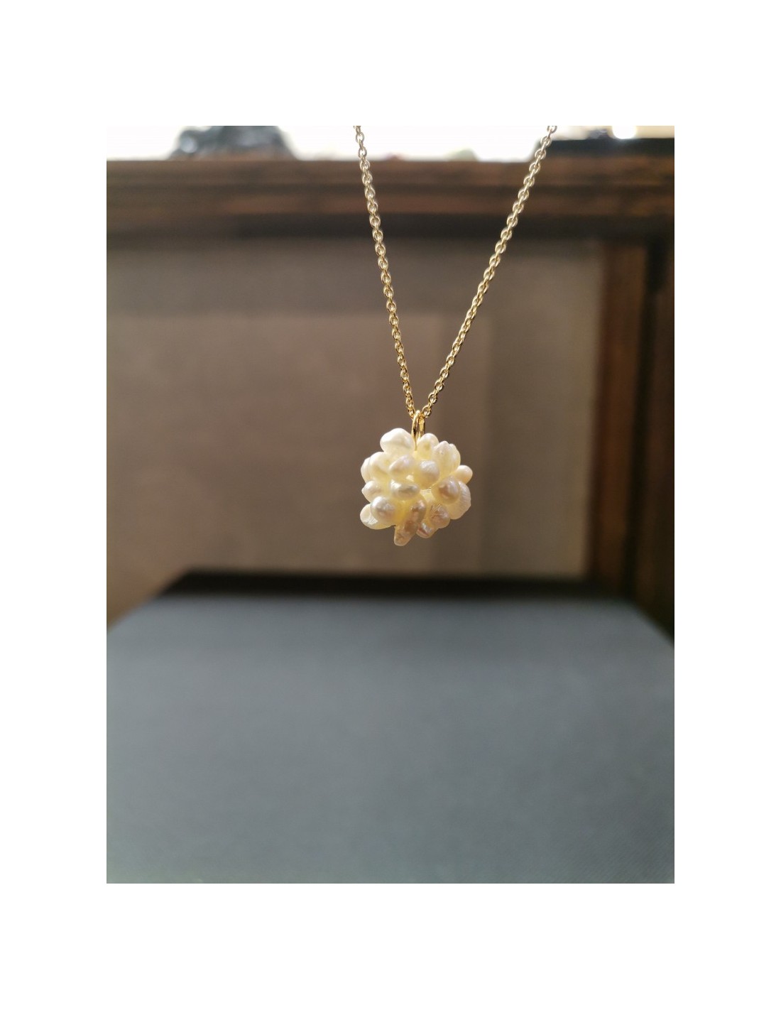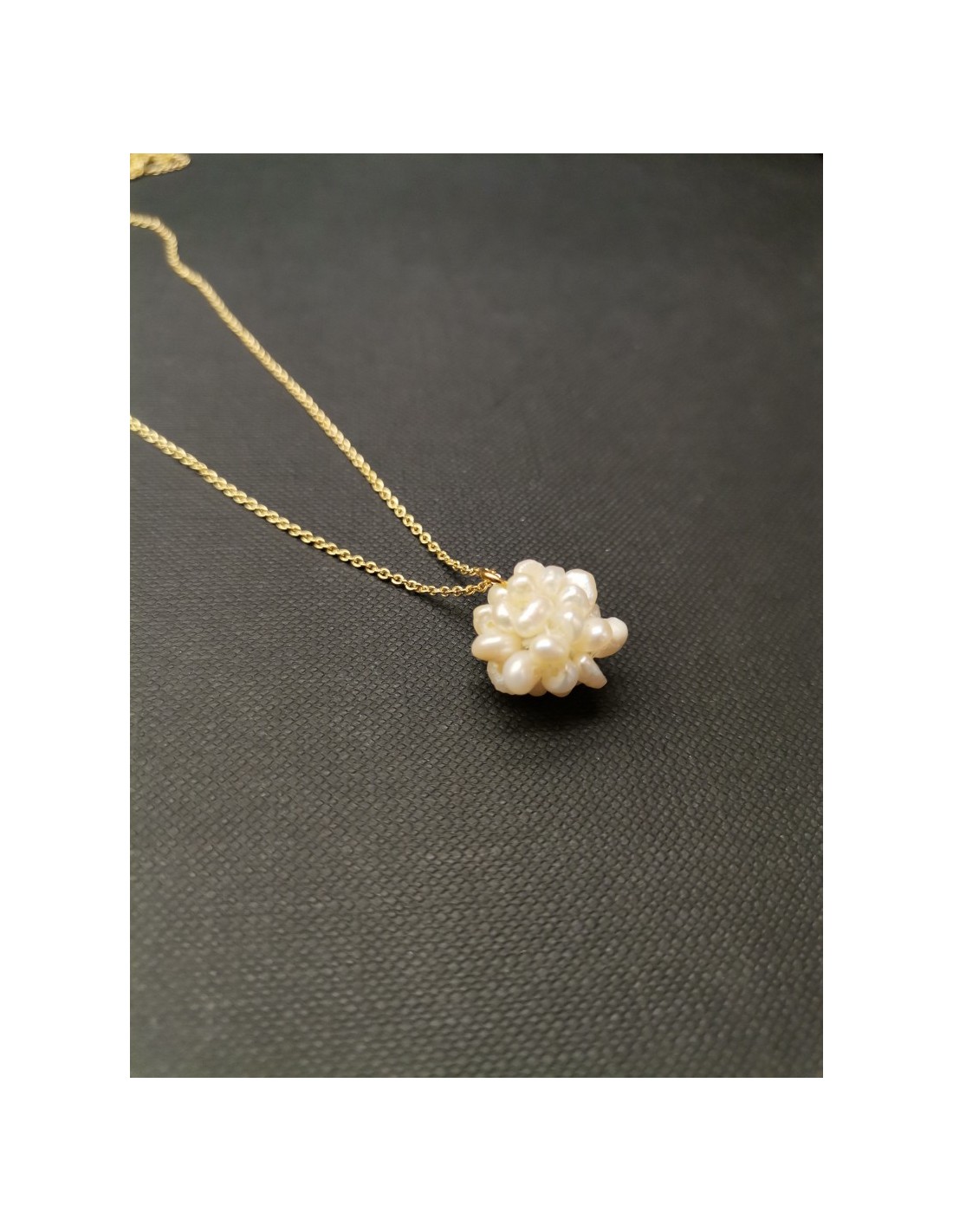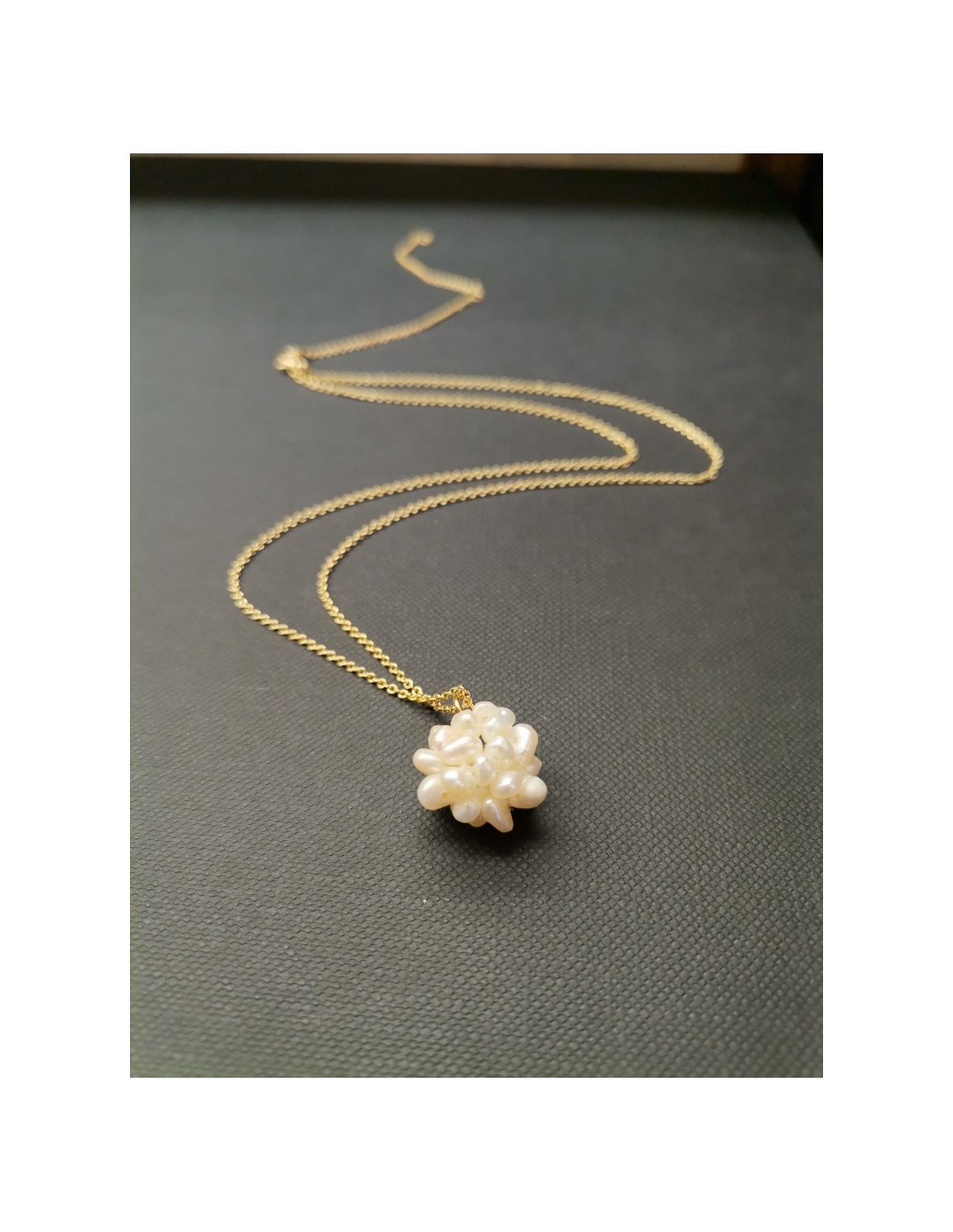 Jemný řetízek ve zlaté barvě s krásným přívěsem ve tvaru kuličky, která je poskládaná z drobných perliček. Krásný decentní doplněk, kterým doplníte pracovní i sváteční outfit. Řetízek má zapínáním na karabinku, celková délka je 38cm s možností prodloužit na 43cm a 48cm. Průměr ověsu z perliček je 1,2cm.