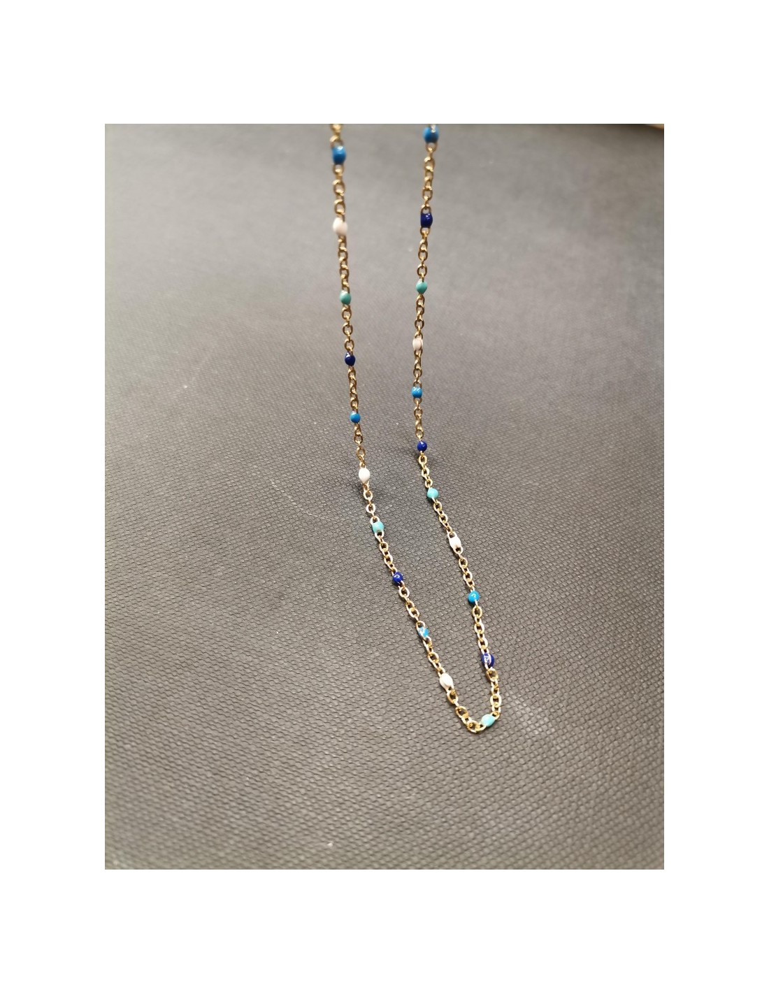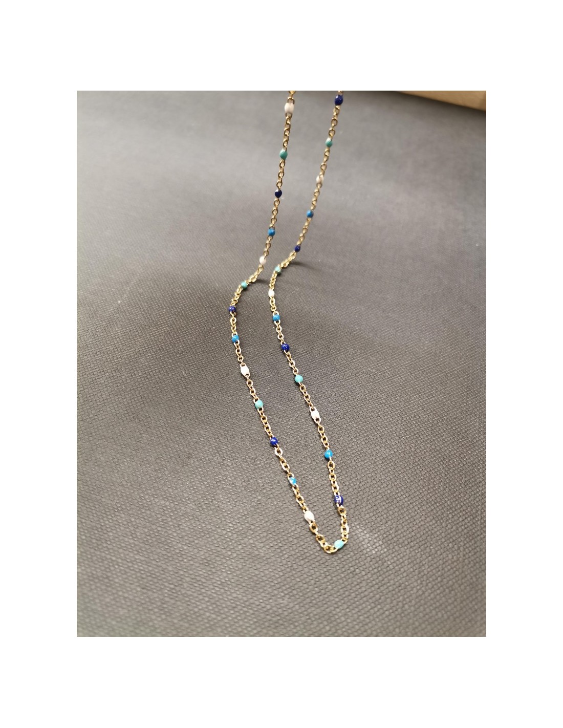 Jemný řetízek ve zlaté barvě s barevnými detaily v podobě "korálků" v odstínech modré. Řetízek má zapínáním na karabinku.