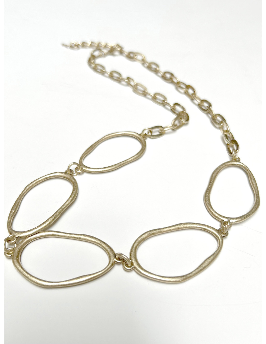 Chic kovový náhrdelník z řetízku a ozdobných ok v matné zlaté barvě.