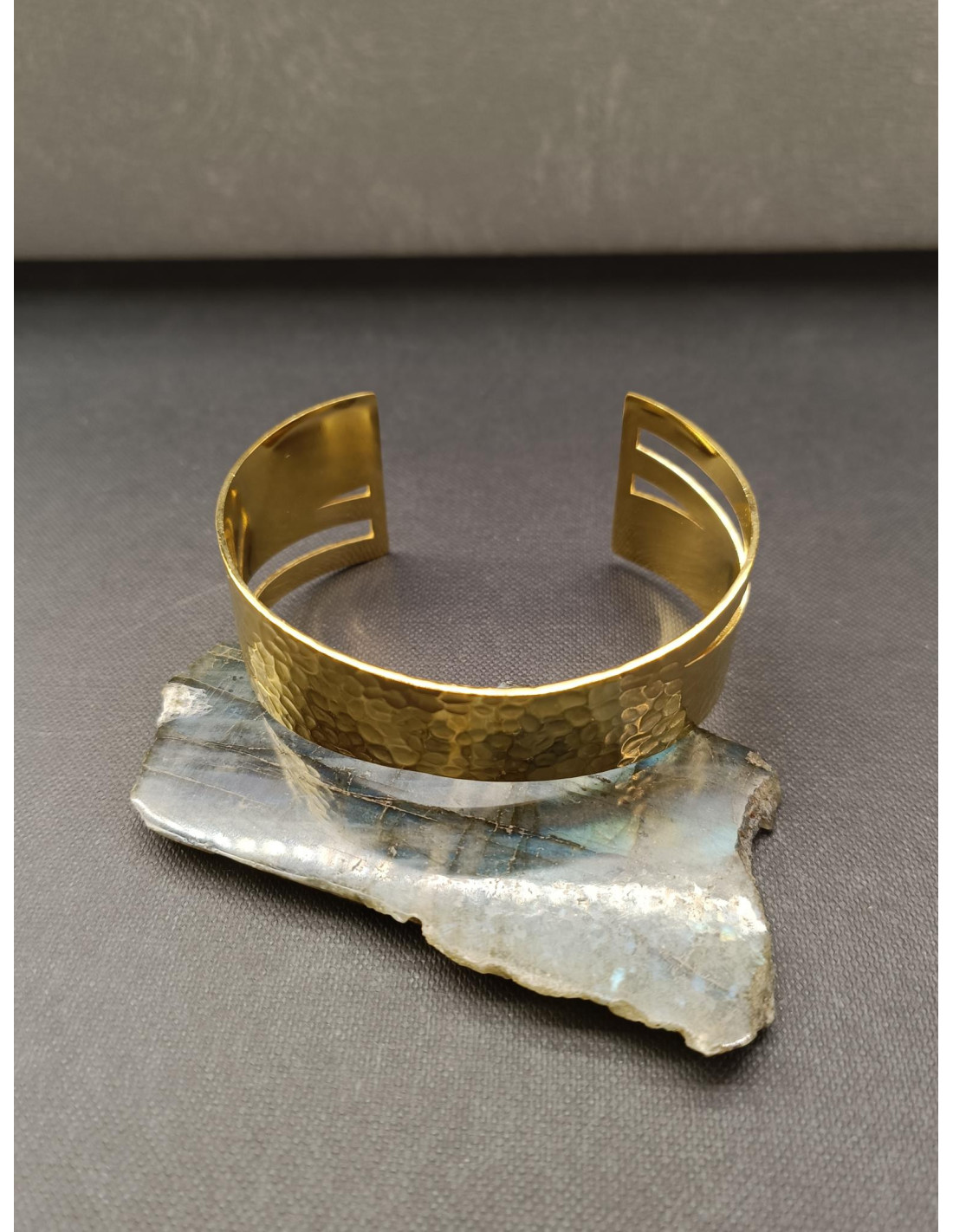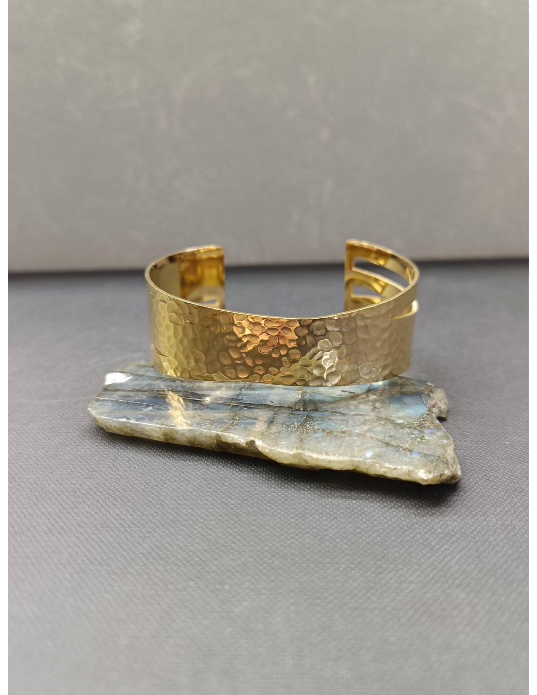 Tento elegantní náramek z nerezové oceli ve zlaté barvě je skvělým doplňkem pro každou příležitost. Pevný náramek zdobí tepaný vzor a jeho nepravidelný vzhled, které mu dodávají nadčasový šmrnc. Snadno se nasazuje díky rozevření.