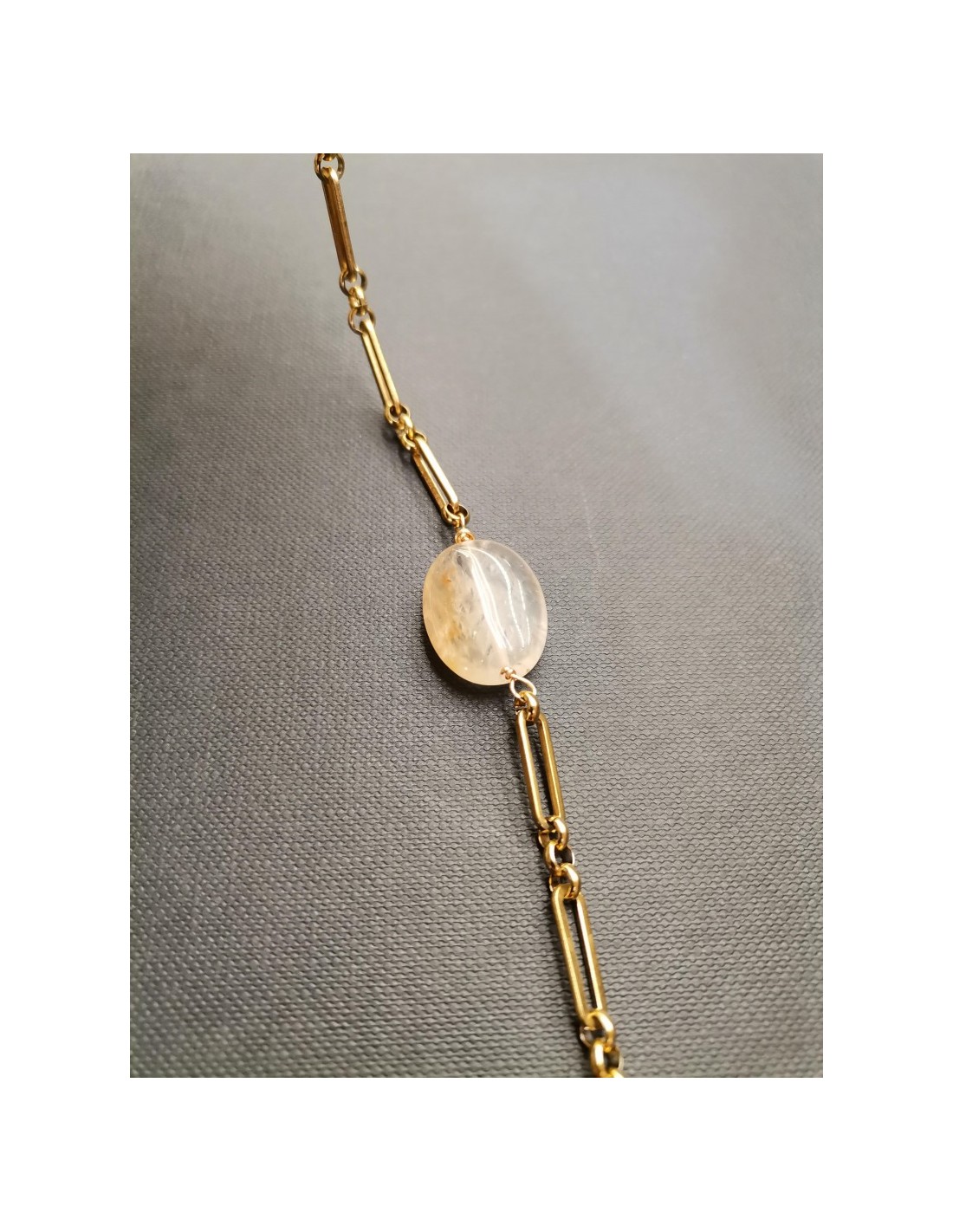 Krásný náramek ve zlaté barvě tvoří podlouhlá spojená očka s průsvitným achátem v béžové barvě. Náramek má zapínání na karabinku.