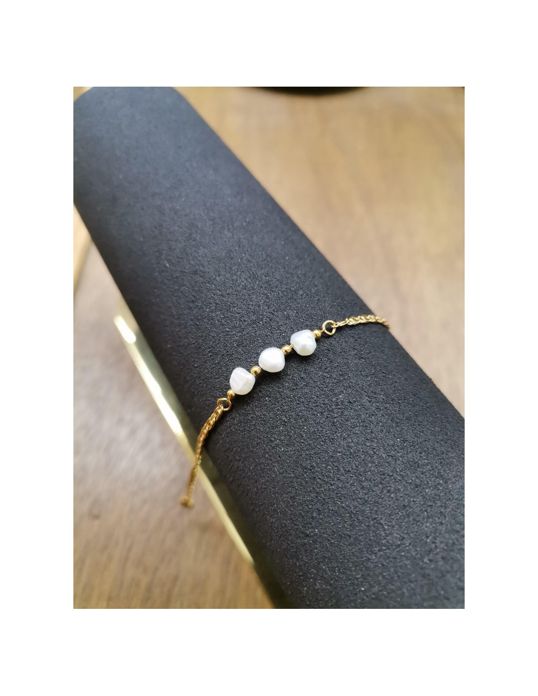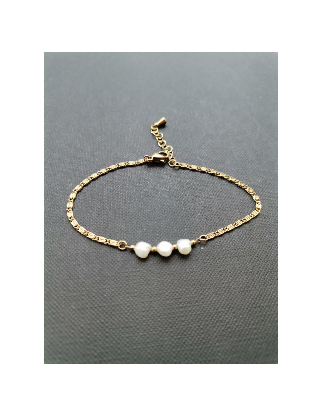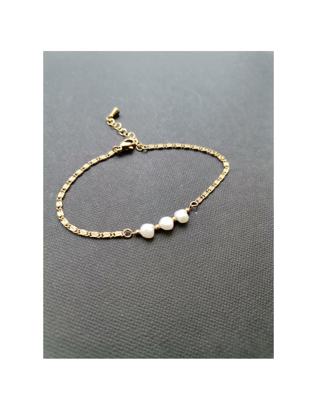 Zlatý řetízkový náramek z nerezové oceli s ozdobným prvkem 3 sladkovodních perliček. Náramek má krásný ozdobný řetízek se zapínáním na karabinku.
