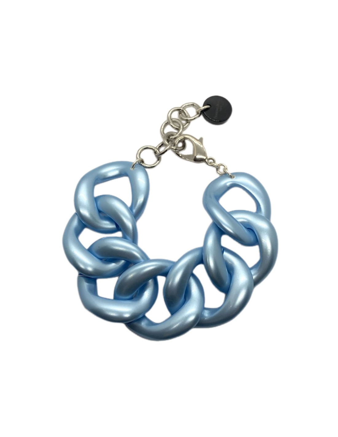 Originální náramek podle posledních trendů je skvělým doplňkem pro Váš outfit. Náramek tvoří tvarovaná, propojená oka v perleťově modré barvě. Náramek má zapínání na karabinku, díky řetízku si jeho délku můžete upravit. Náramek z limitované edice bižuterie pro ženy, které mají rády neotřelý šarm Pařížanek.