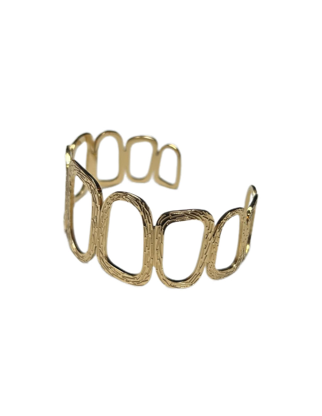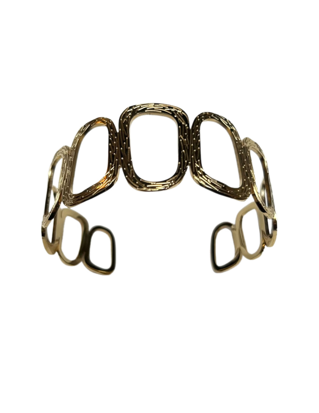 Rozevřený kovový náramek.