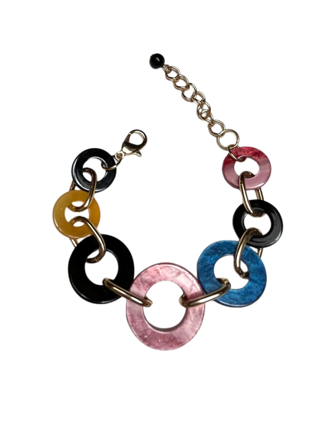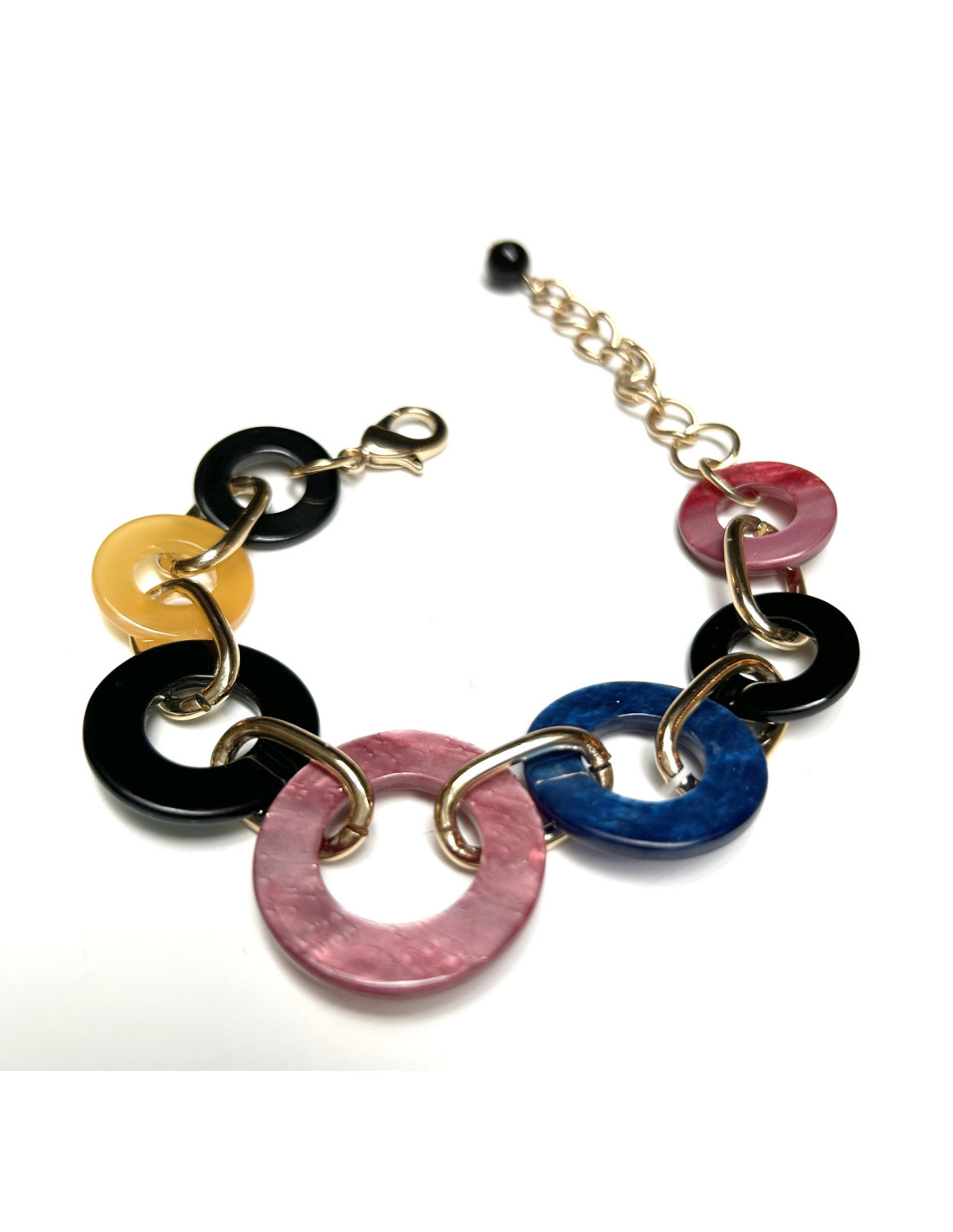 Slušivý náramek z různě velikých kulatých prvků propojených zlatou spojkou a se zlatým řetízkem.
