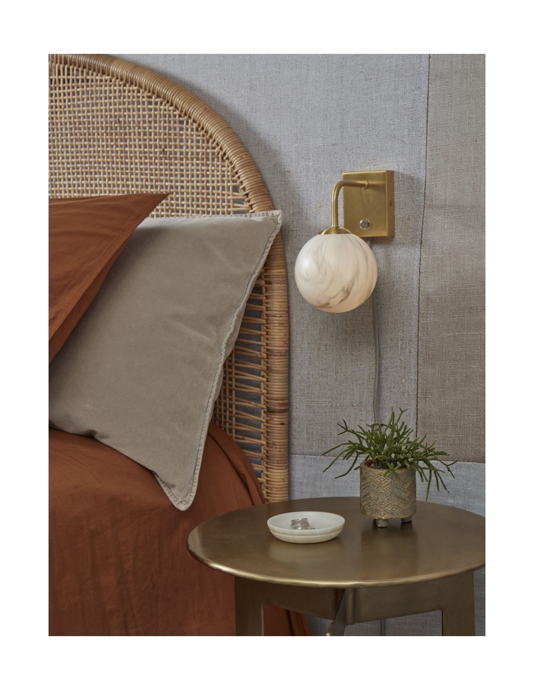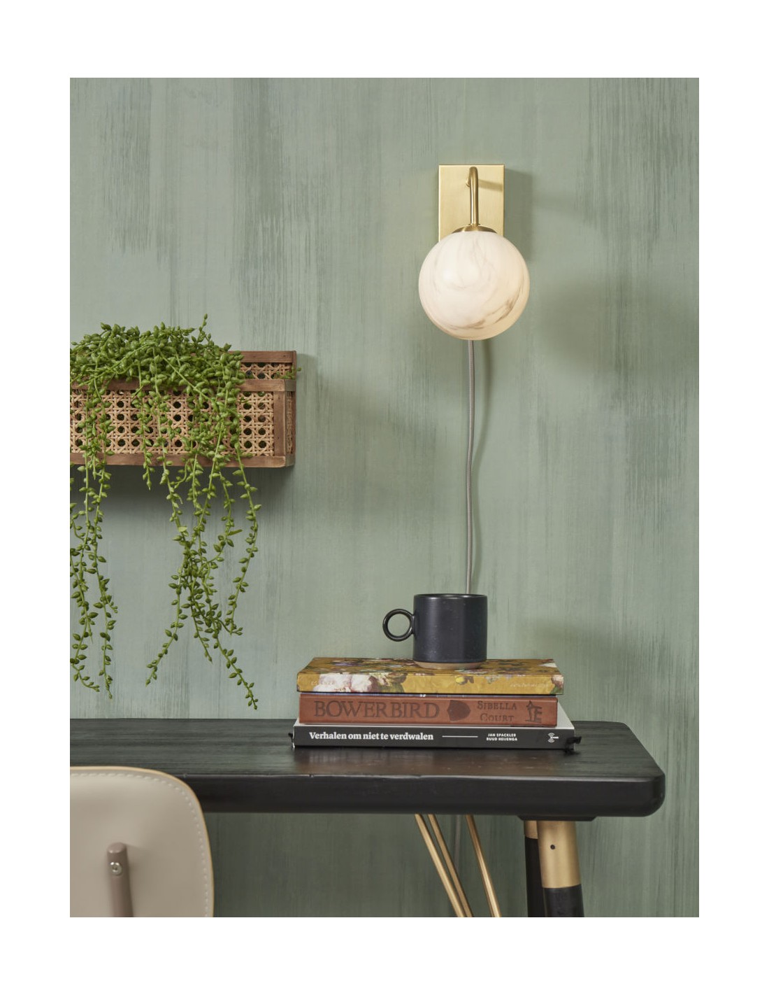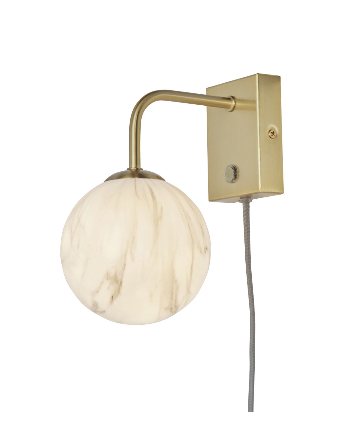 Nástěnná zlatá lampa s kulatým skleněným stínítkem se hodí umístit do mnoha typů interiárů. Jednoduché linie spolu s mramorovaným sklem a zlatou barvou připomínají dobu a styl Art Deco a přinesou do vašeho domova eleganci.