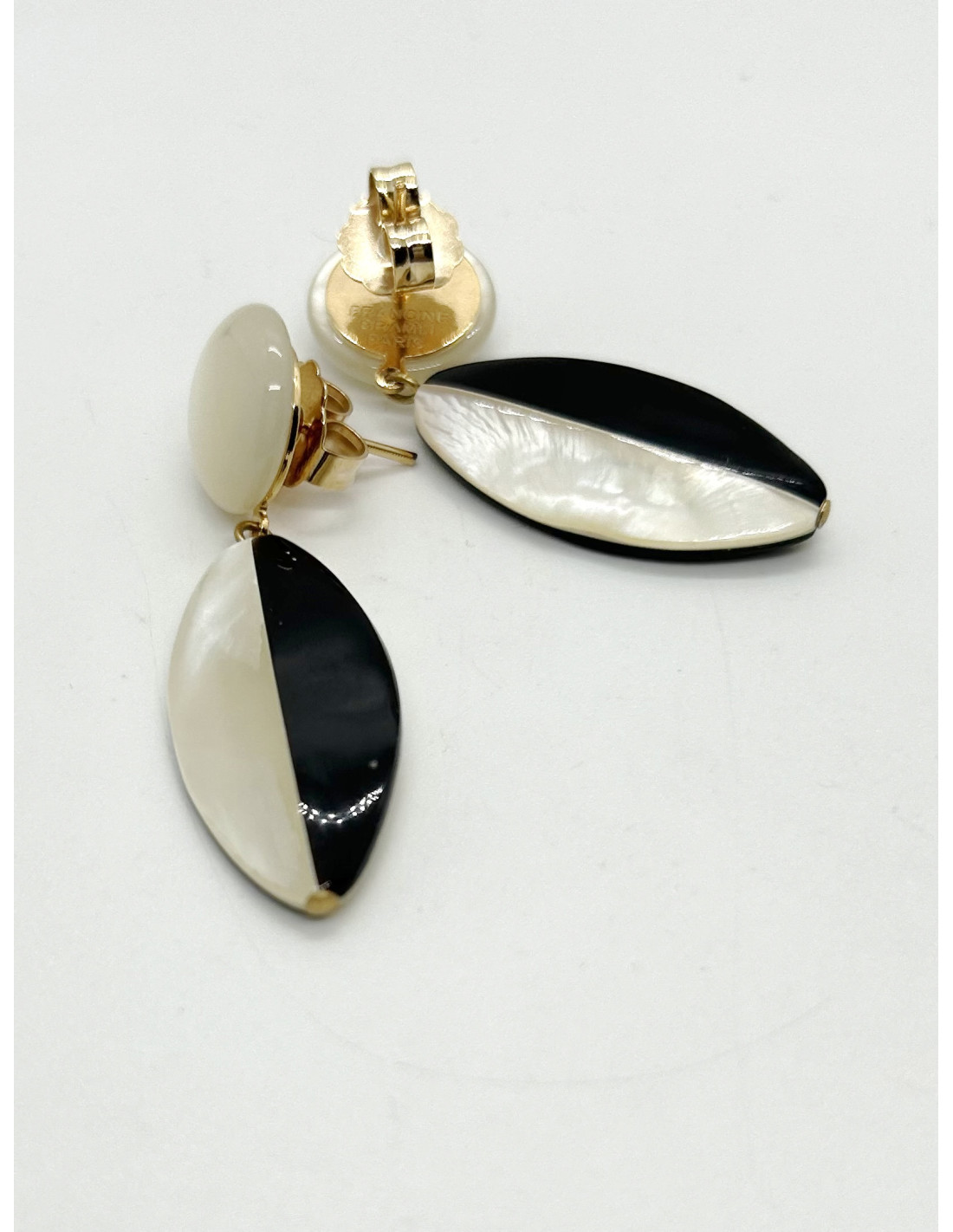 Visací náušnice tvoří ověs ve tvaru špičaté ploché kapky v černé a perleťové barvě. Náušnice mají zapínání na puzetu.