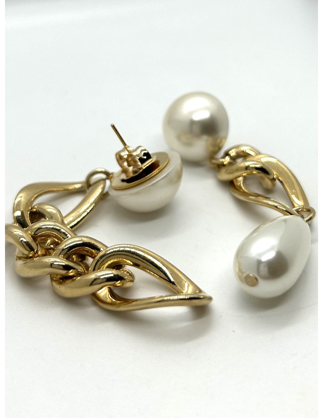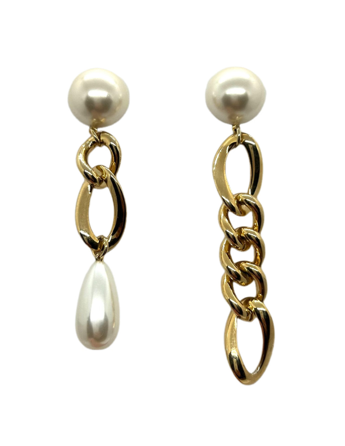 Visací asymetrické náušnice z kovu ve zlaté barvě a bílých perel | FRANCINE BRAMLI