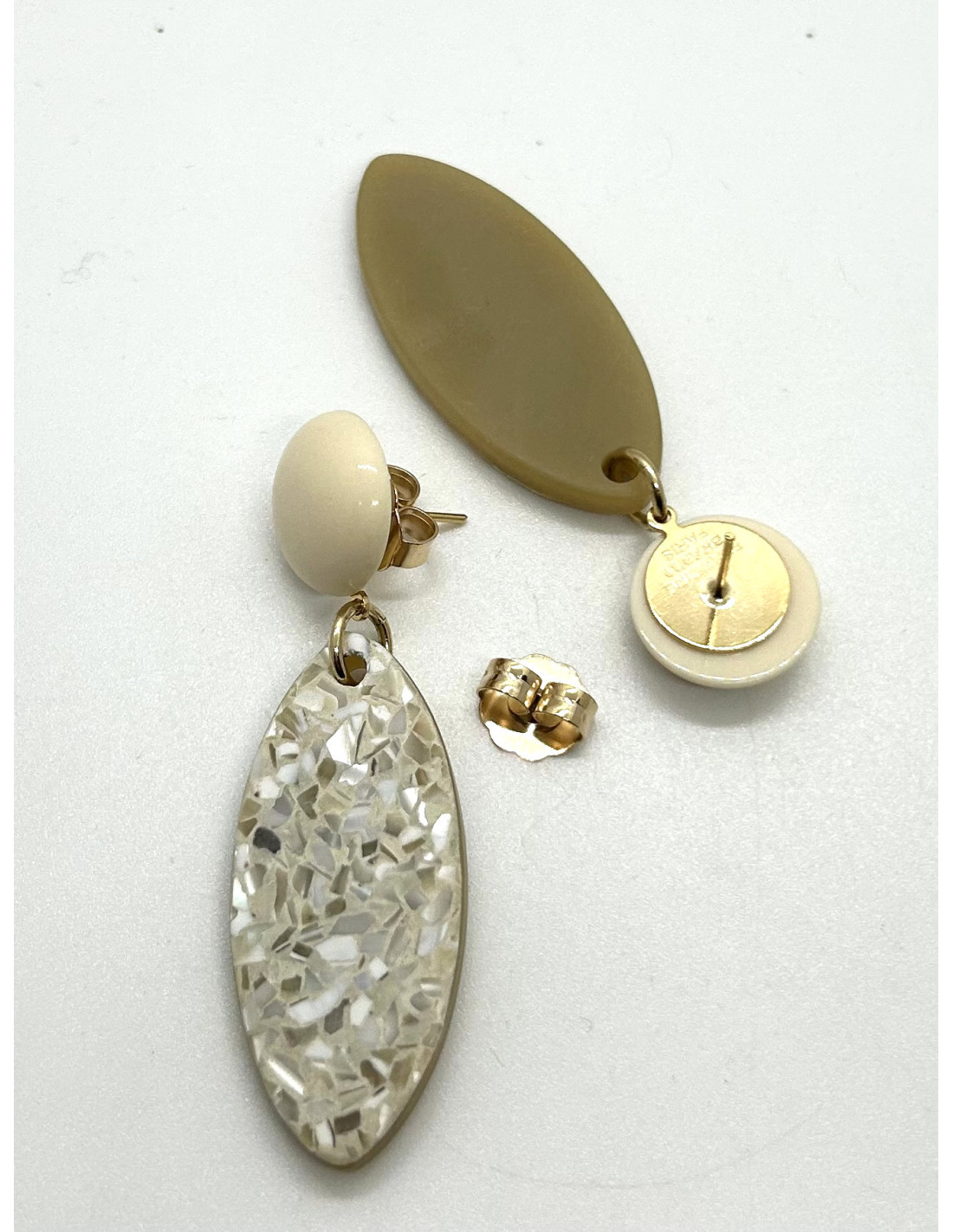 Vneste do své šperkovnice kousek moderního umění. Tyto náušnice inspirované ikonickým vzorem terrazzo jsou obohaceny o střípky pravé perleti, které jsou precizně zalité do vysoce leštěné pryskyřice. Výsledkem je fascinující mozaika, která při každém pohybu hlavy jemně mění odlesky a hraje všemi barvami perletě.