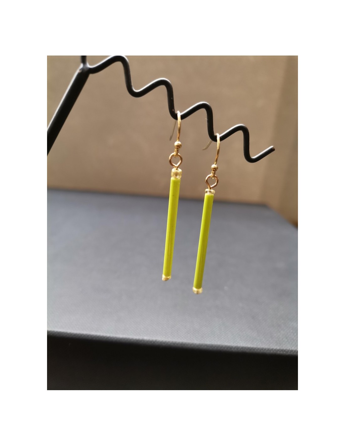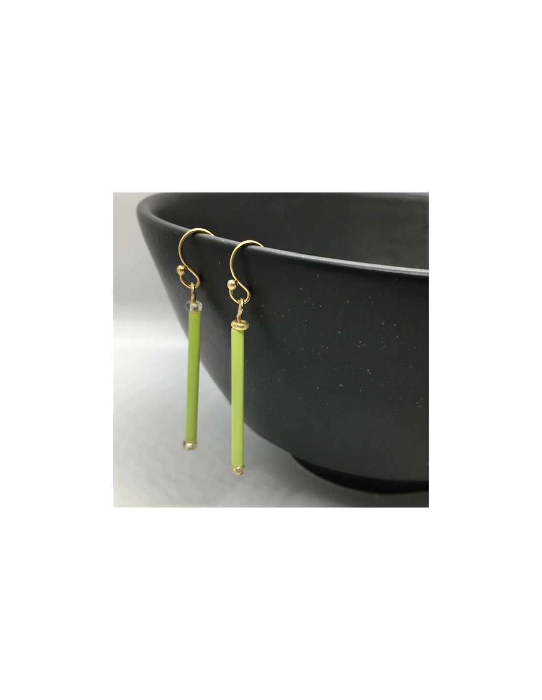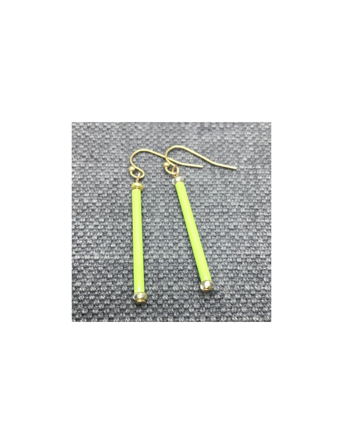 Zelené náušnice tyčky se zlatými prvky. Délka náušnic je 4cm, průměr 0,3mm.