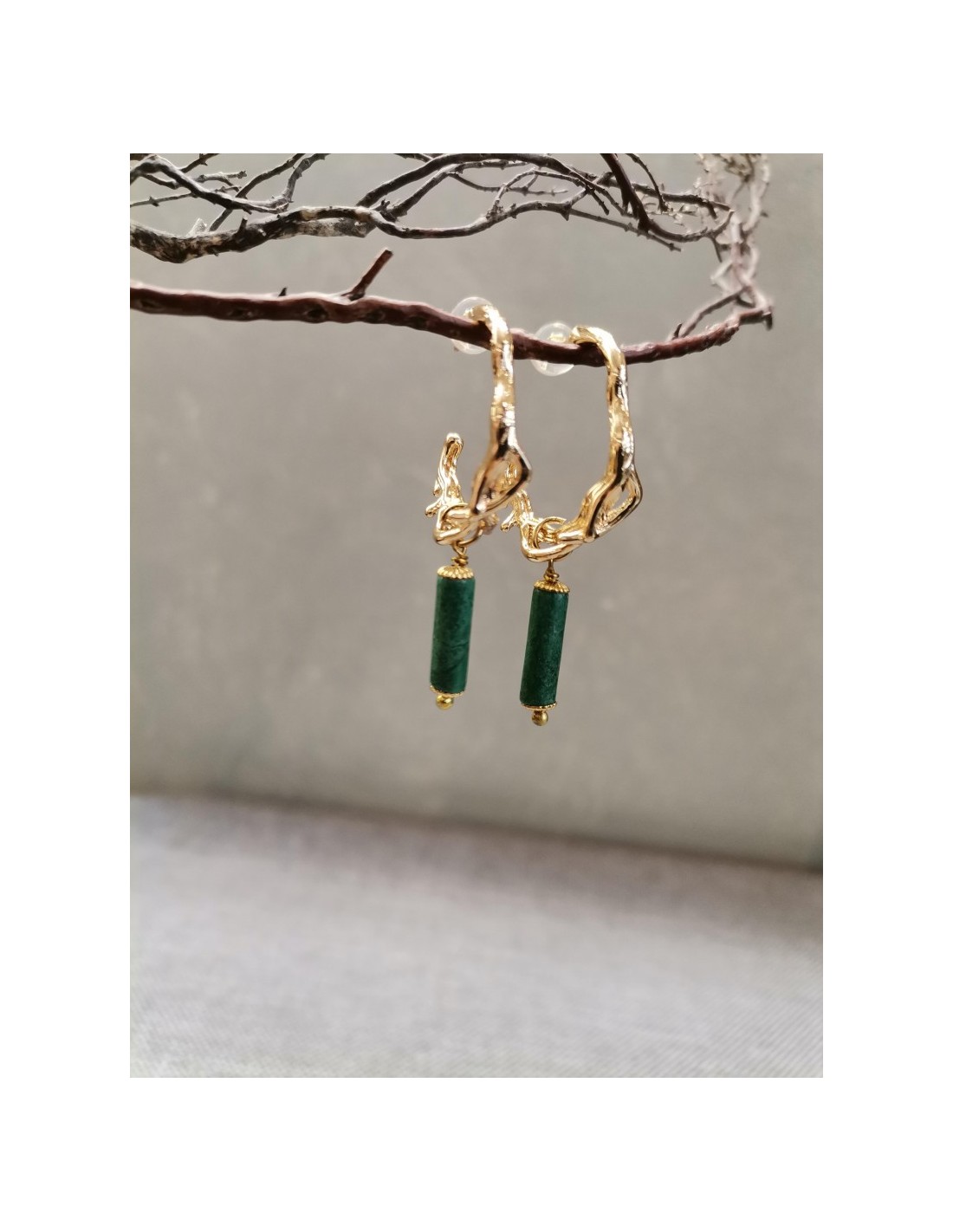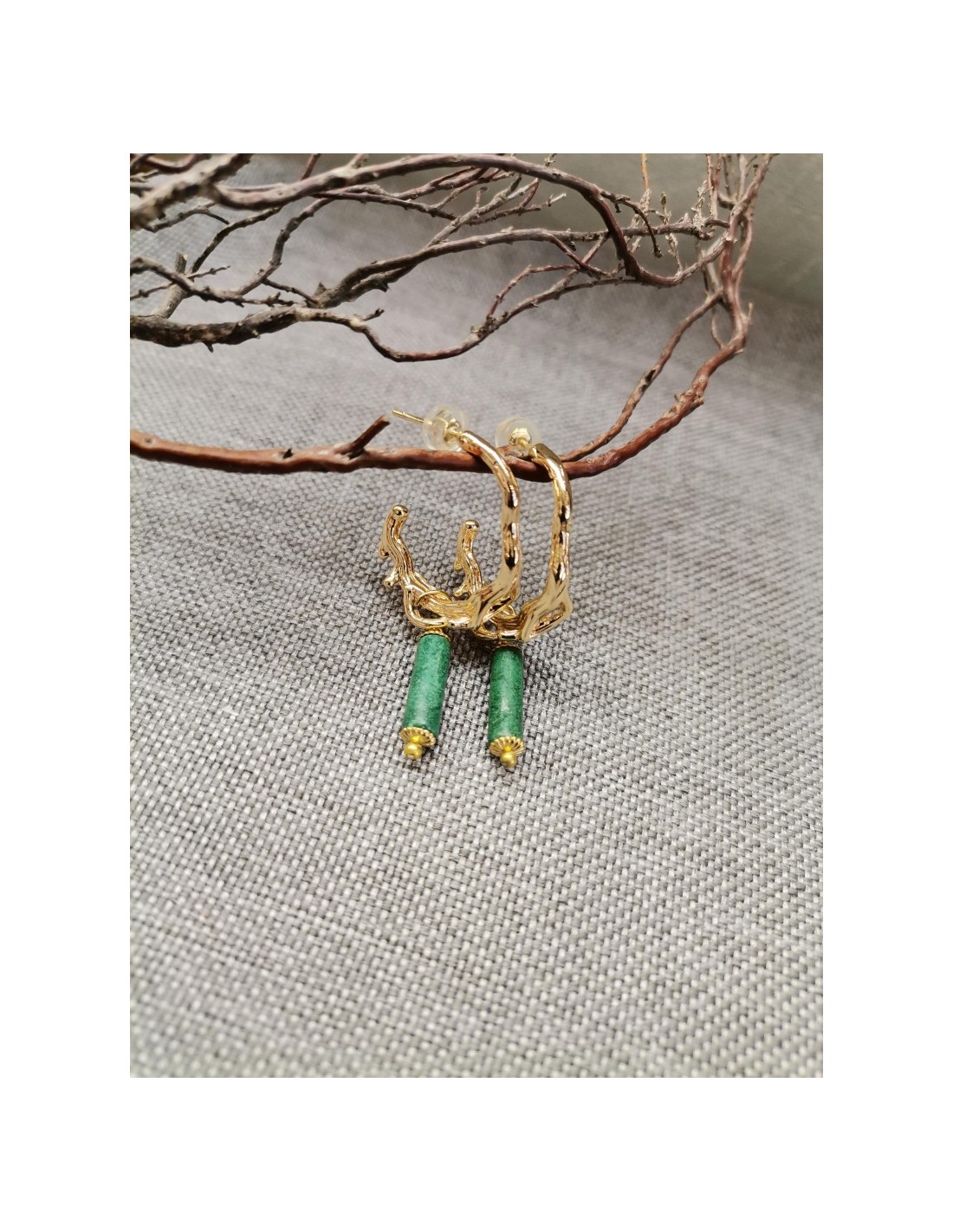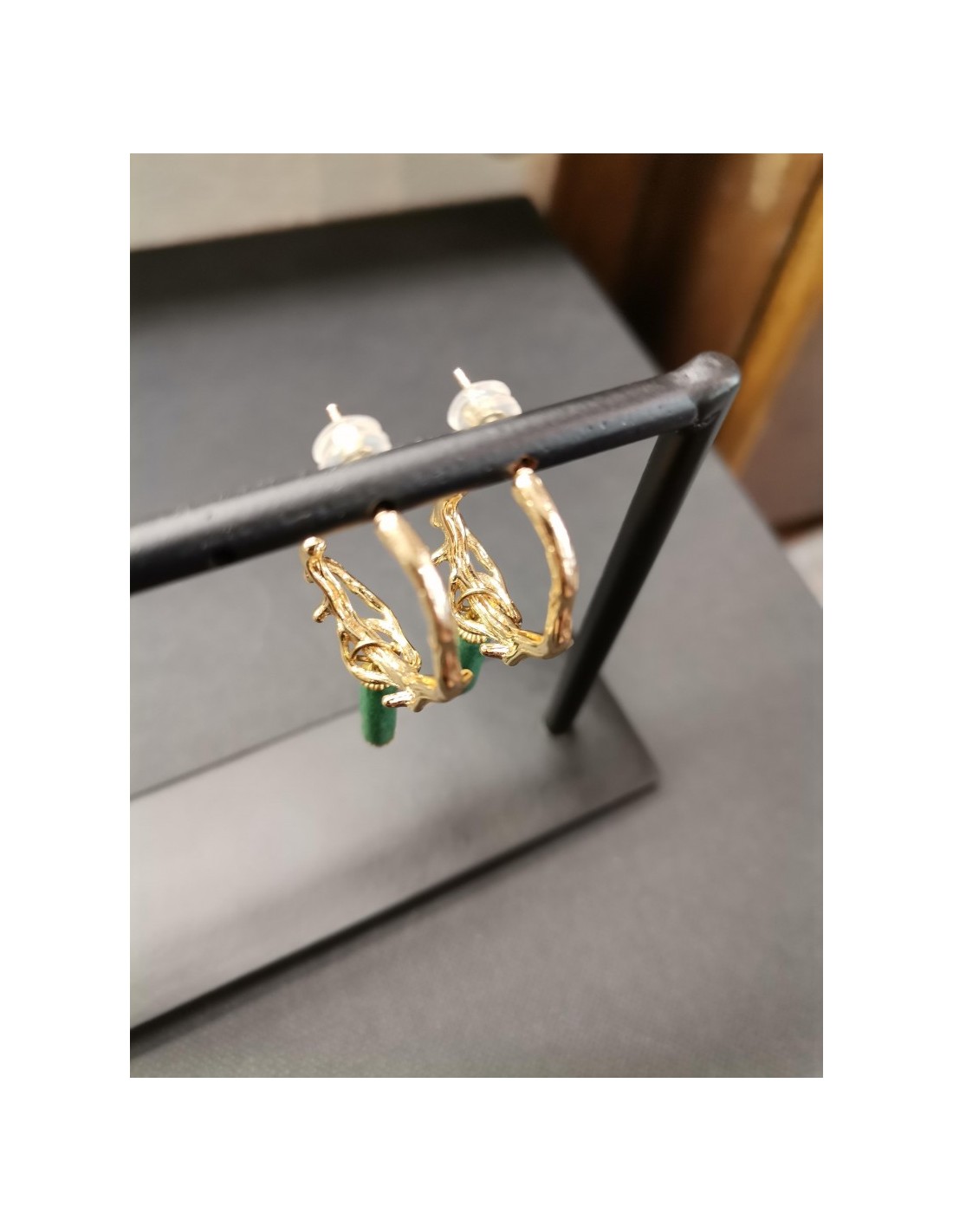 Zlaté náušnice, nepravidelné kruhy se zeleným oválným kamínkem, se zapínáním na puzetku. Průměr kruhu je 2c, délka 4,2cm.