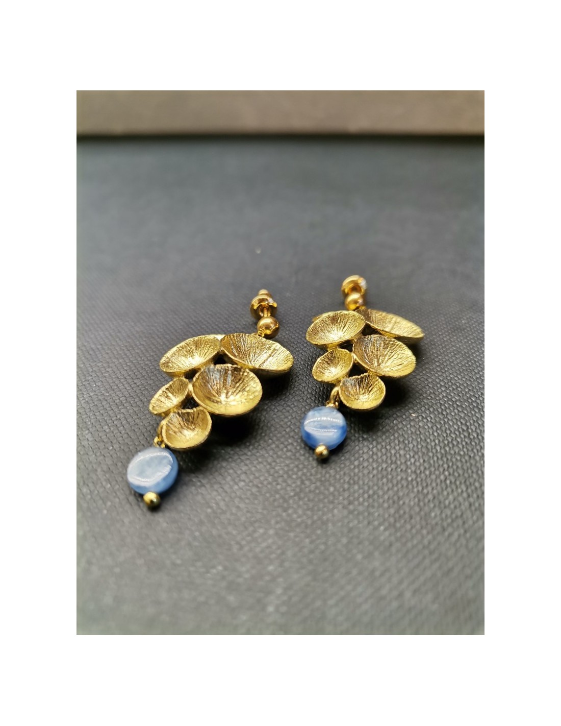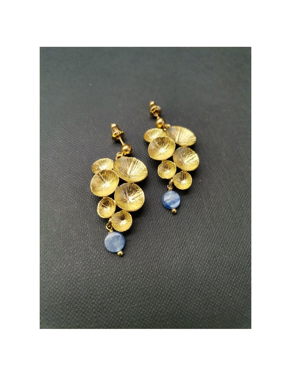 Zajímavé náušnice s tvarem připomínajícím hrozen drobných lotosových listů, který je ukončen polodrahokamem - kyanidem. Náušnice ve zlaté barvě mají zapínání na plastovou puzetku.