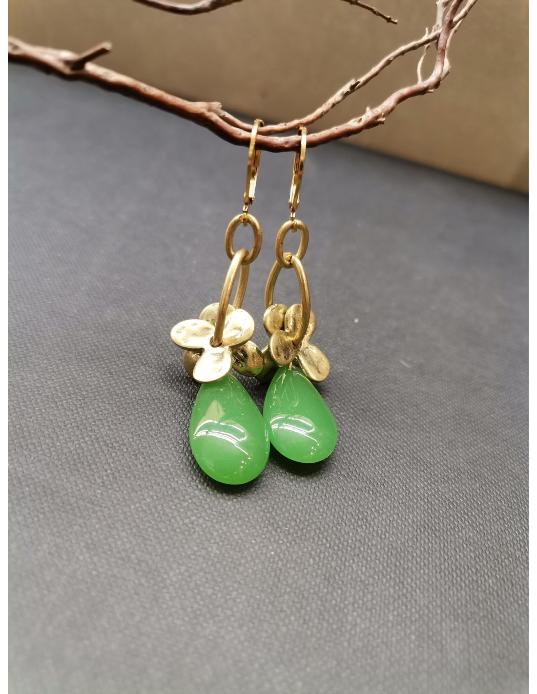 Originální náušnice s květinovým motivem a ověsem ve tvaru mandle ze zeleného skla. Náušnice mají zaklapávací zapínání, které je ochrání před ztrátou.