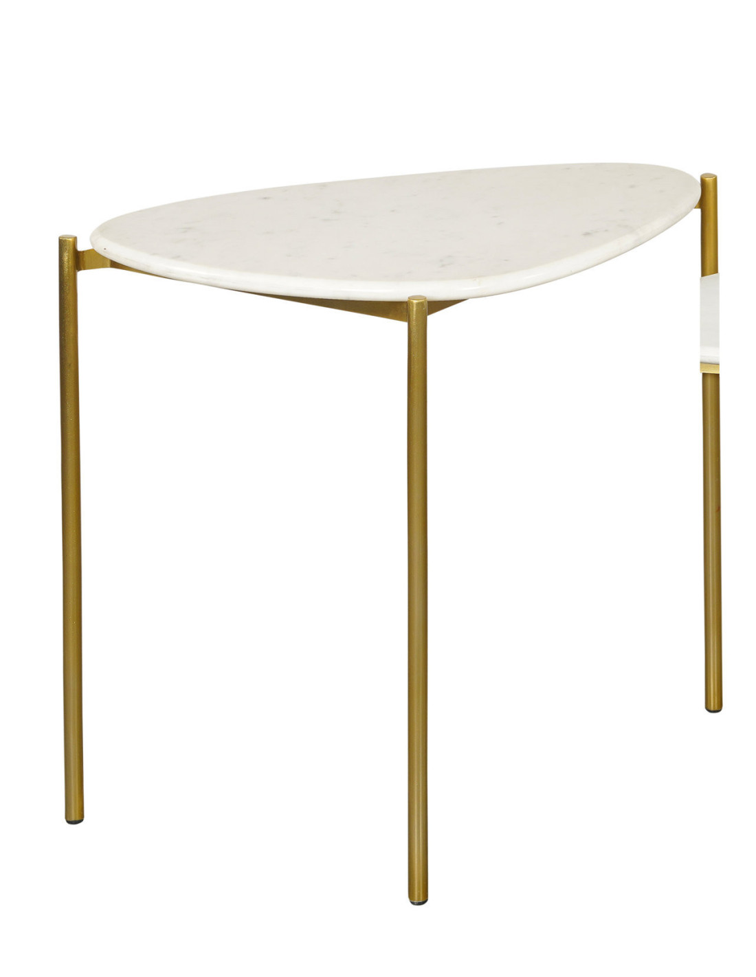 Menší a elegantní stolek se zlatou kovovou nohou a krásnou mramorovou deskou v oblém trojúhelníkovém tvaru. Ideální do obývacího pokoje, kanceláře nebo lounge prostoru. Minimalistický design spojuje moderní estetiku s praktičností, stolek poskytuje prostor pro odkládání nápojů, knih či dekorací, aniž by zabíral příliš místa.