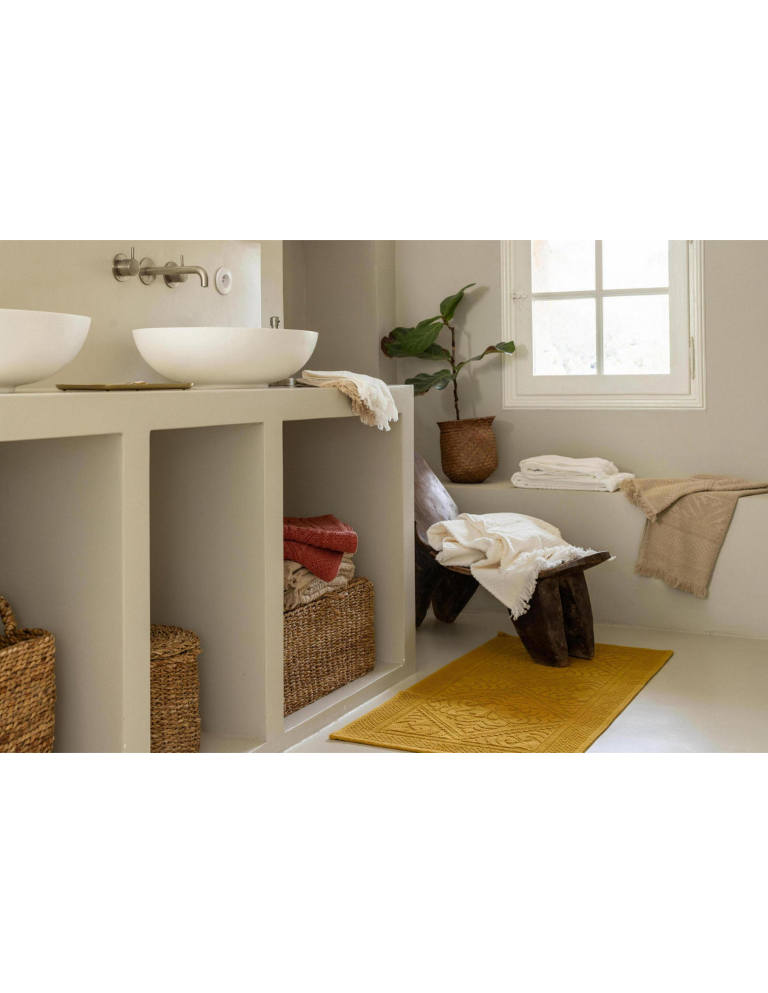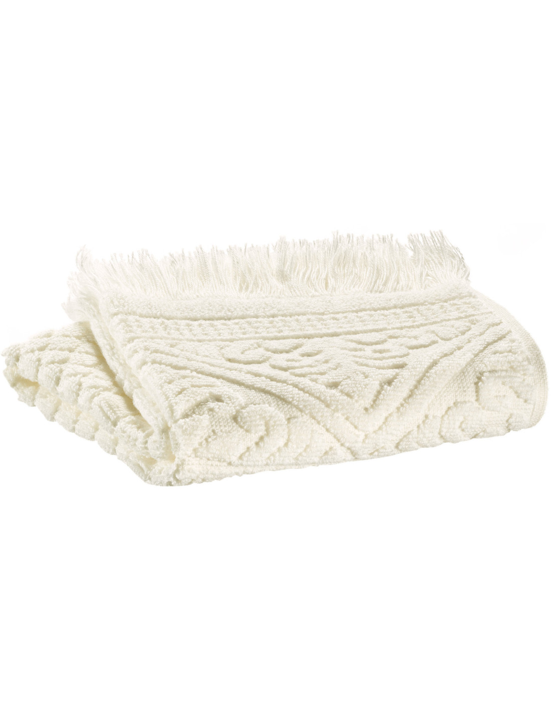 Malý ručník na ruce s vytkávaným vzorem a třásněmi v křídově bílé barvě. Ručník je vyrobený ze 100% bavlny, lze ho prát v pračce a žehlit.