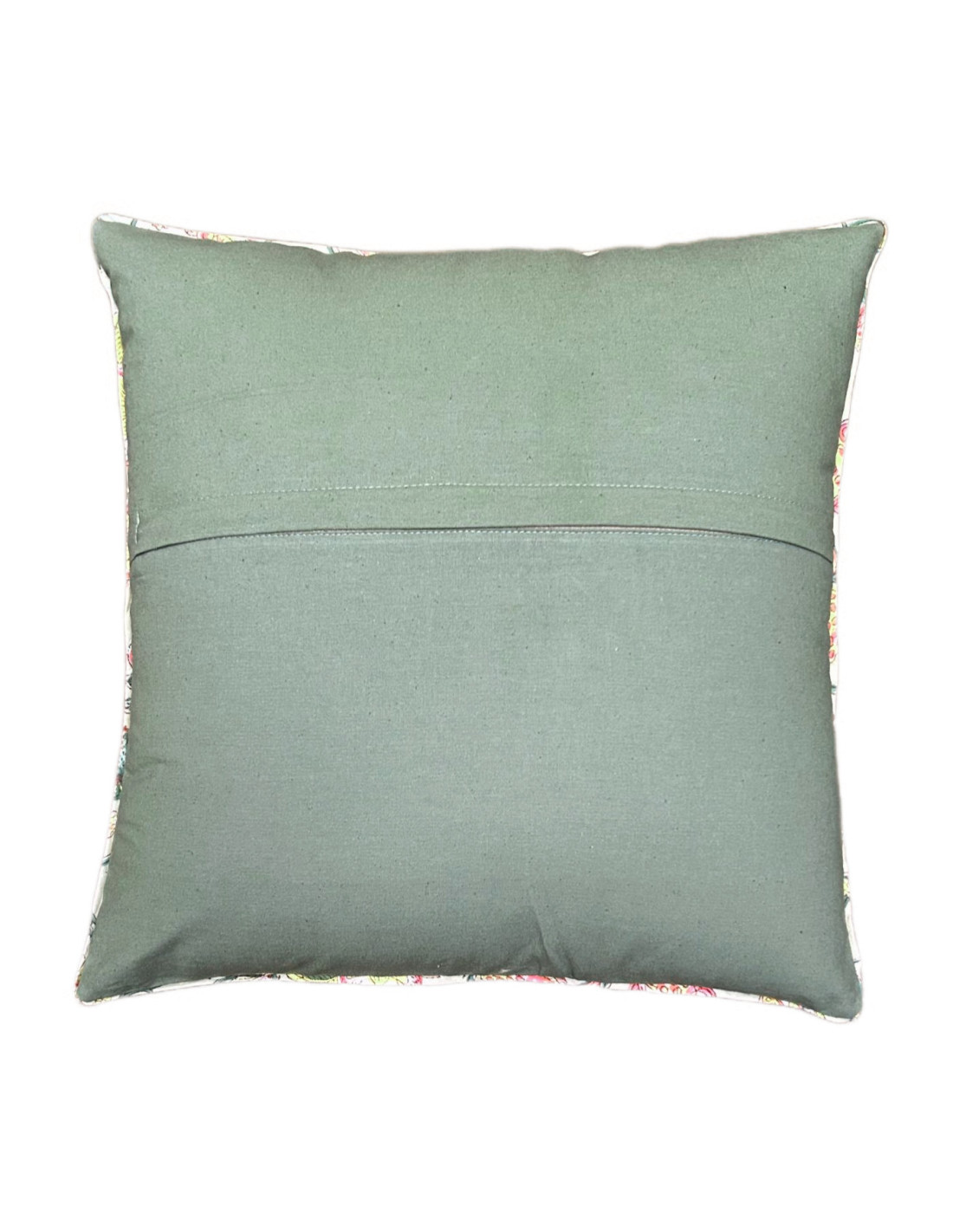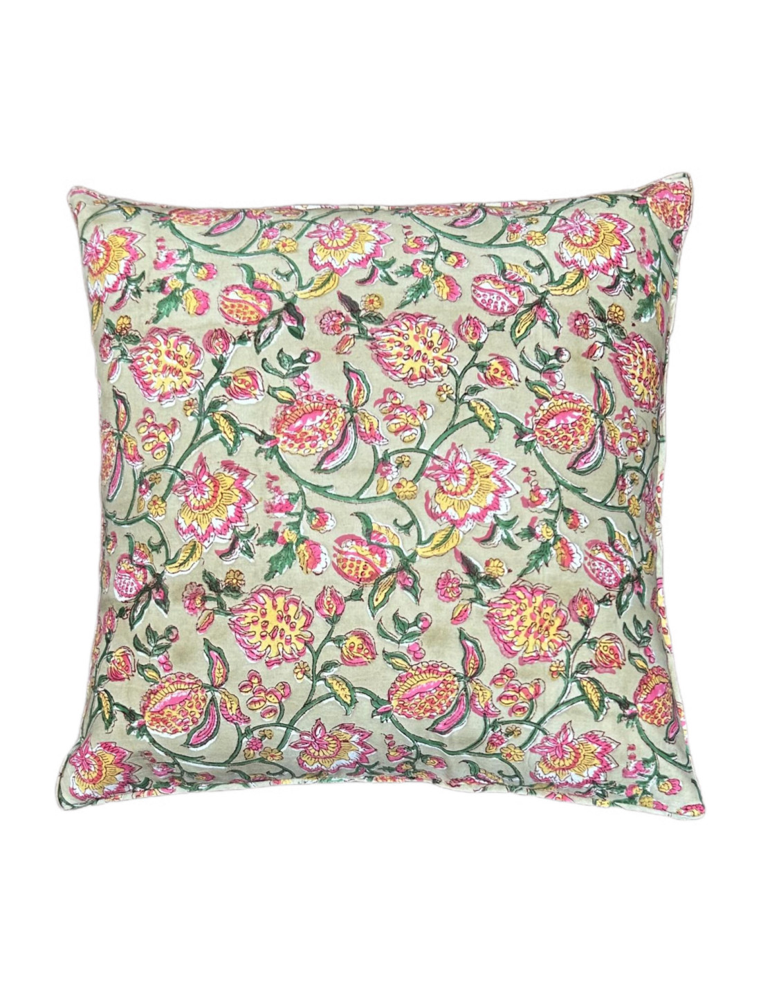 Krásný dekorativní povlak na polštář s podkladem v béžové barvě na které je ruční potisk s květinovým motivem. Tento úžasný polštář vynikne ve vašem interiéru na pohovce, křesle i posteli. Kombinovat ho můžete s jednobarevnými povlaky a vytvořit si osobitou kompozici. Bavlněný povlak je příjemný na omak, rubová strana je z jednobarevné, světle zelené látky, okraj povlaku je lemován paspulí.