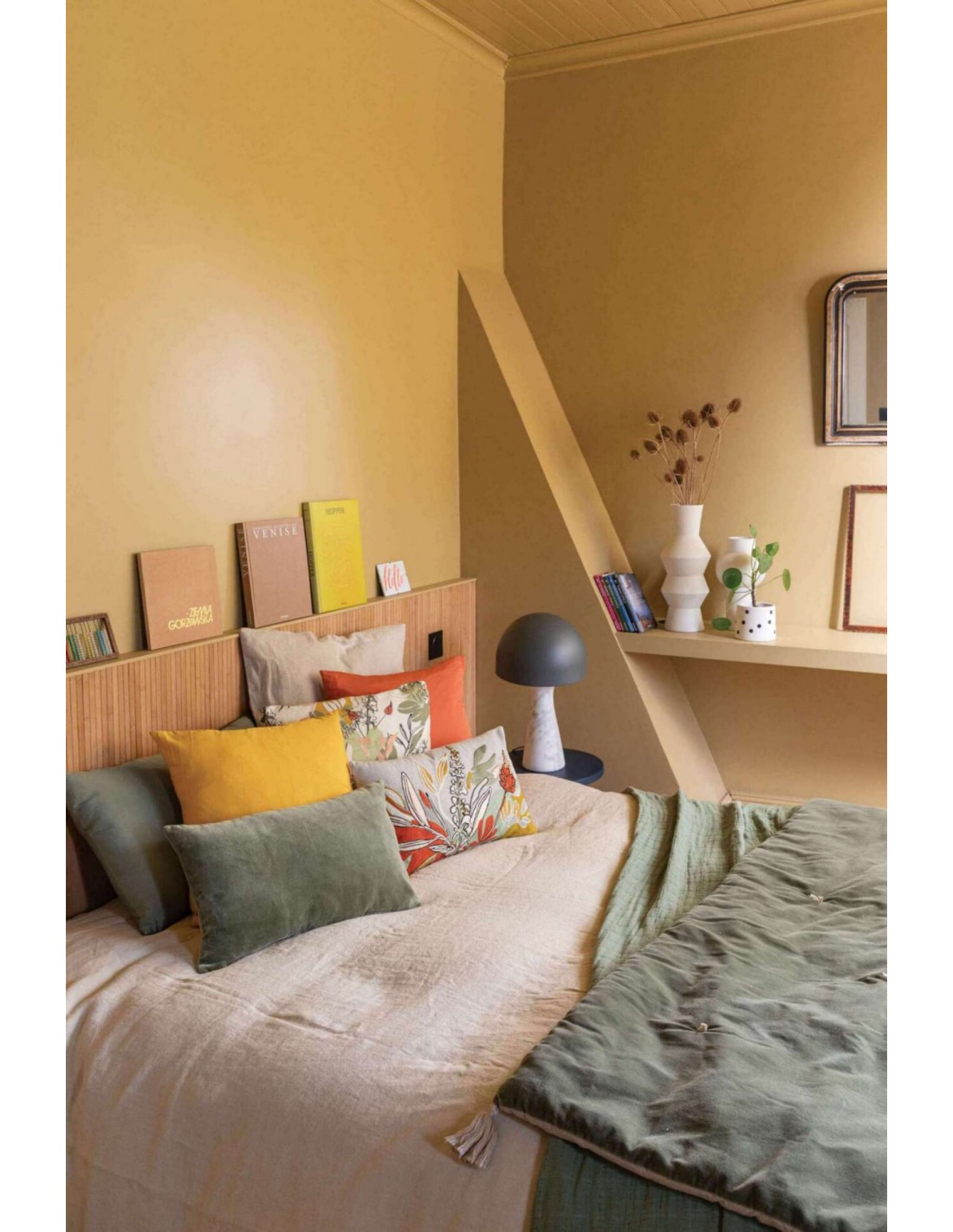 Sametový povlak na polštář v příjemné tlumené světle zelené barvě, která je barvou listů verbeny. Zadní strana polštáře je z béžového, bavlněného materiálu. Zapínání na zip.
